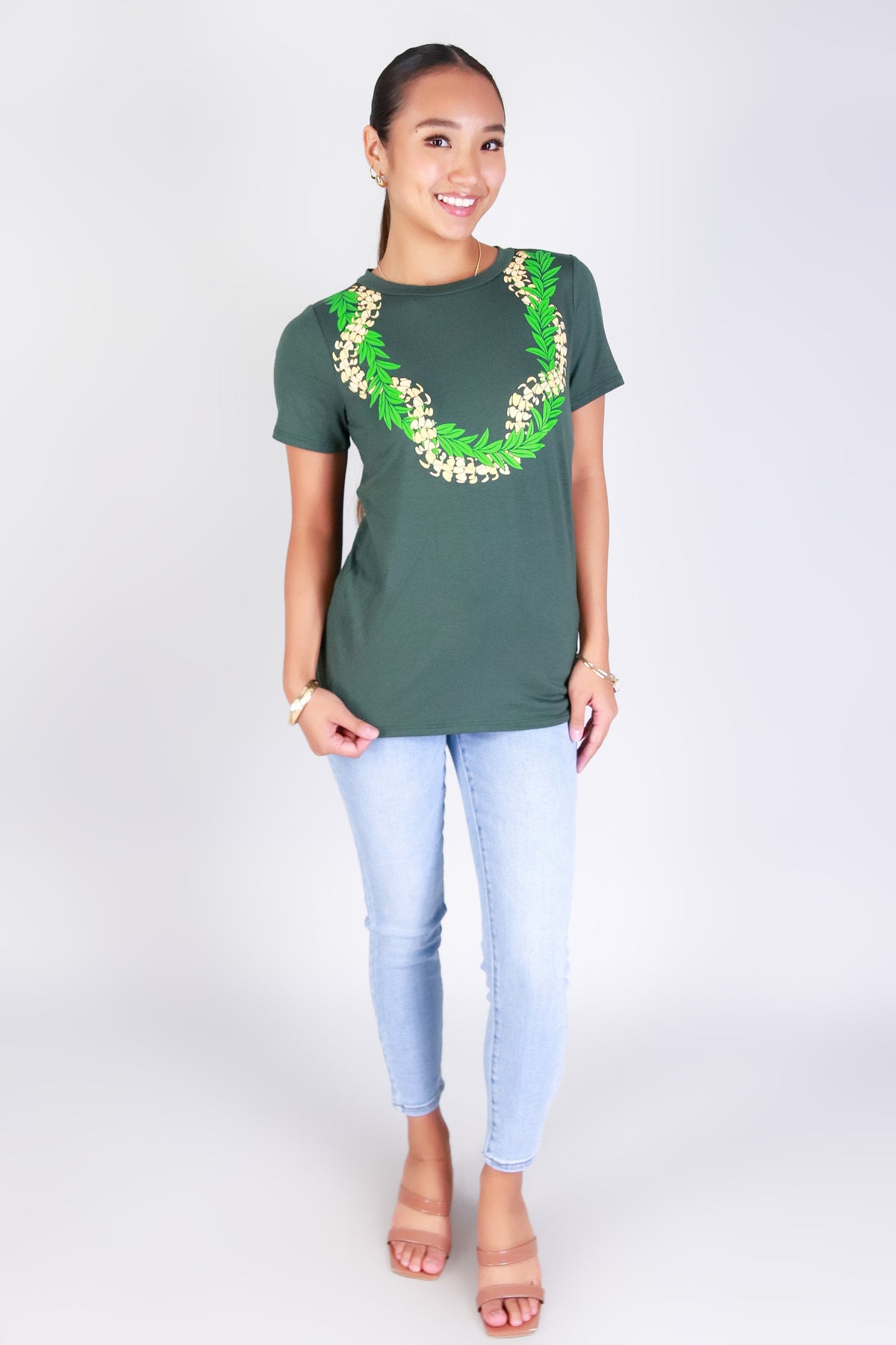 PUAKENIKENI MAILE LEI TEE is available in color DK.OLIVE and in size SMALL, MED, LARGE, XL.