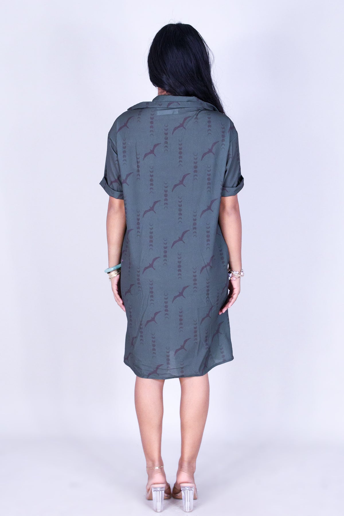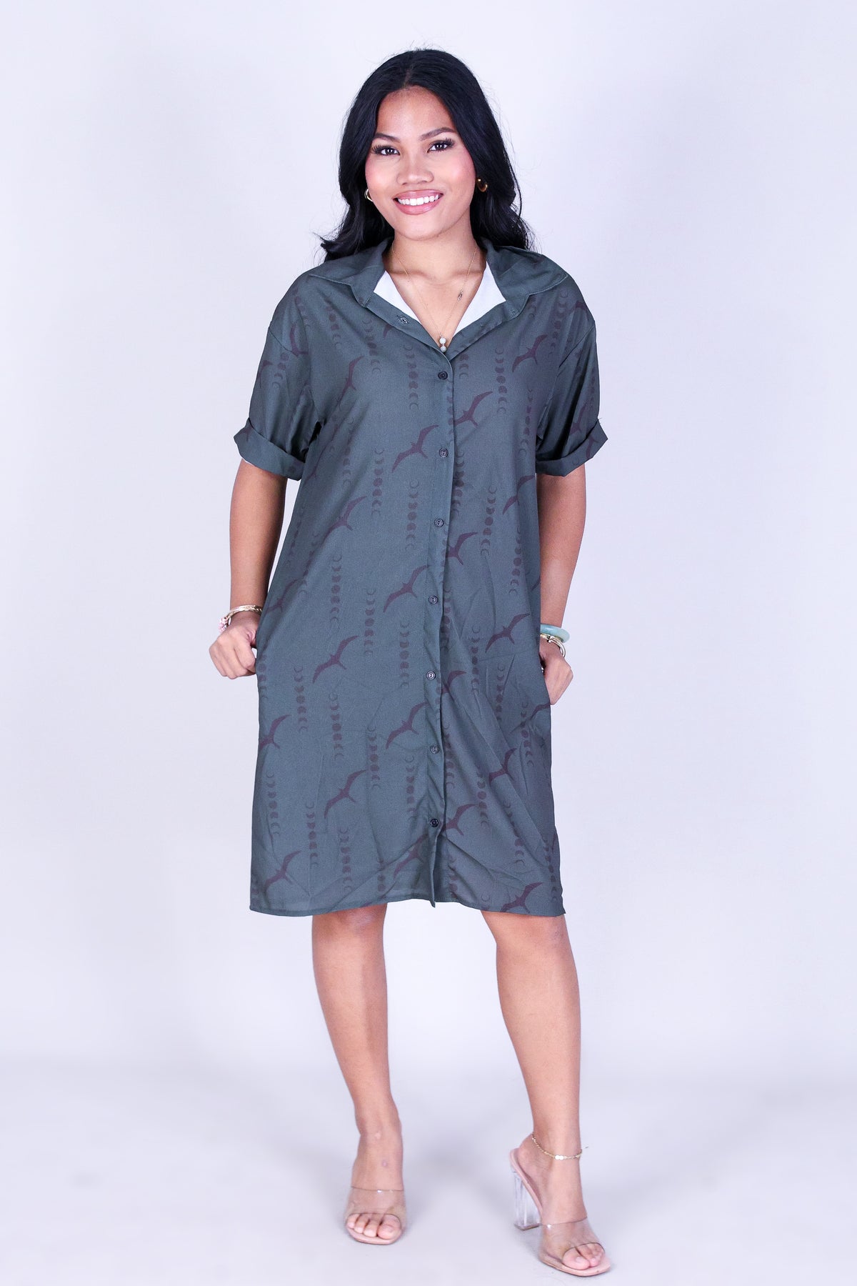 IWA MOON BUTTON DOWN DRESS is available in color GREY and in size SMALL, MED, LARGE, XL.