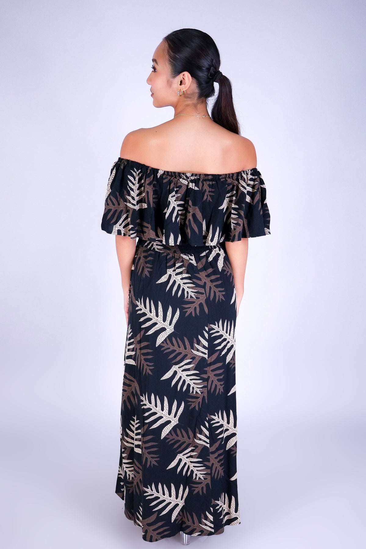 LAUA'E OFF SHOULDER MAXI DRESS is available in color BLACK and in size SMALL, MED, LARGE.