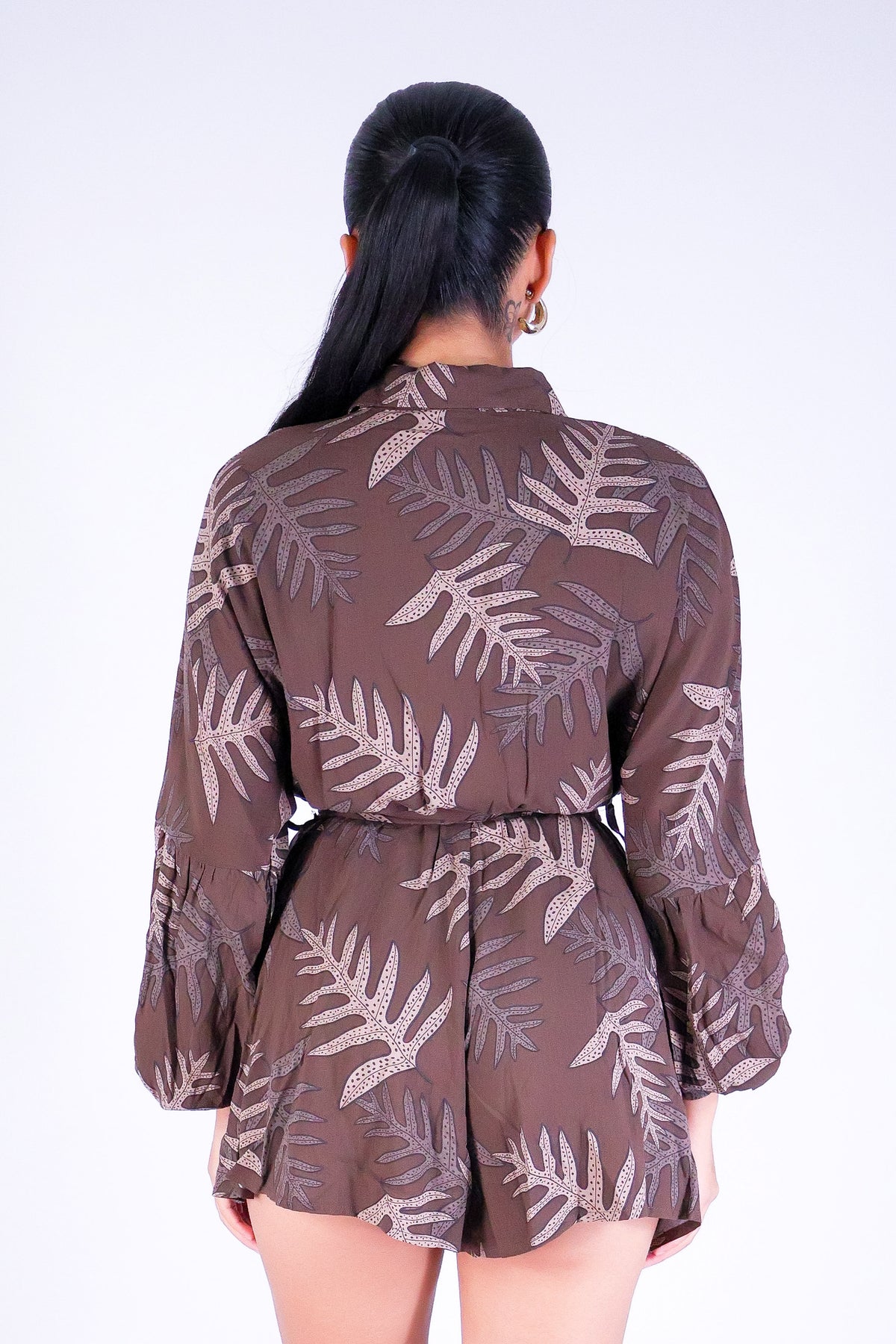 LAUA'E LONG SLEEVE ROMPER is available in color BROWN and in size SMALL, MED, LARGE.