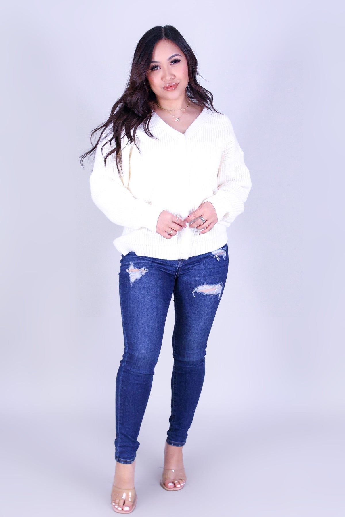 MODERN GLOW CARDIGAN is available in color IVORY and in size SMALL, MED, LARGE.
