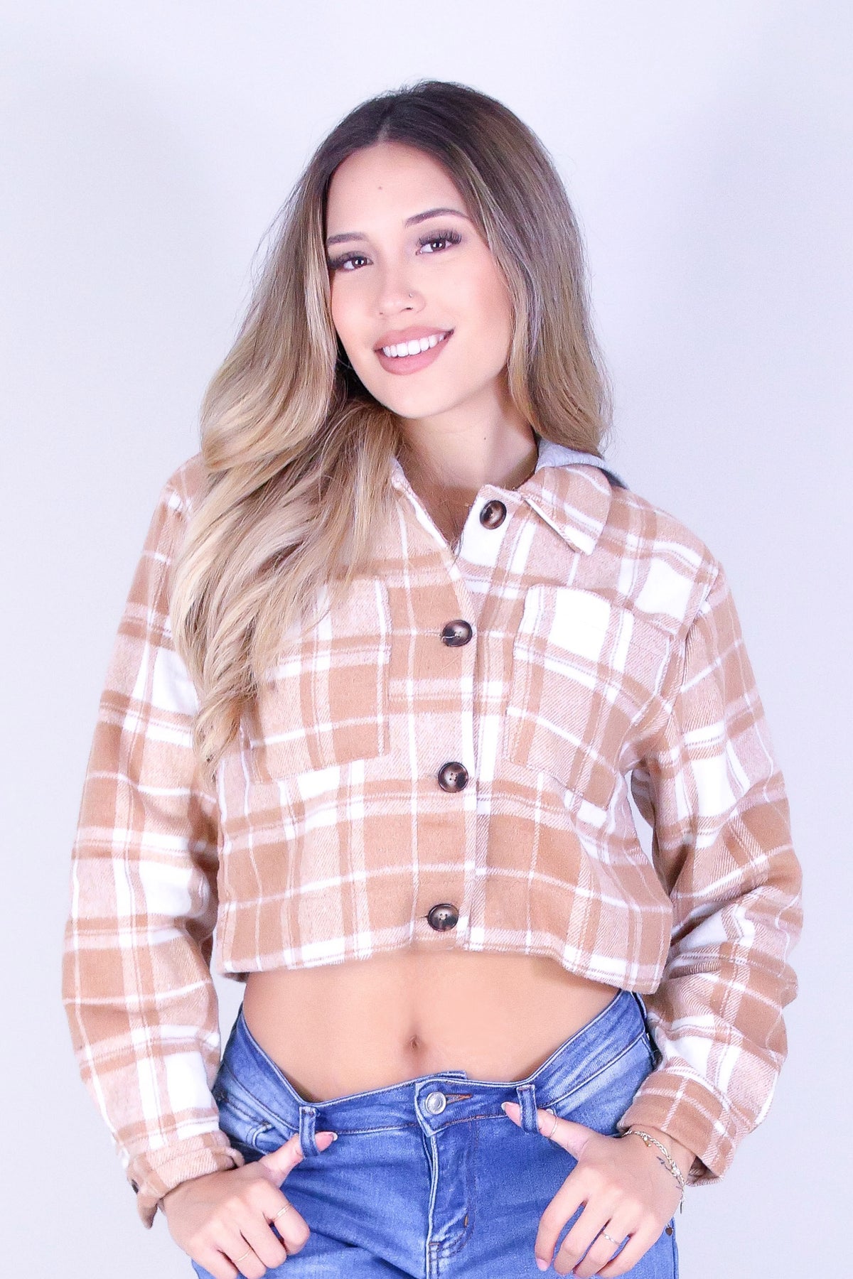 SOFT CHECK CROP PLAID SHACKET is available in color Camel and in size SMALL, MED, LARGE.