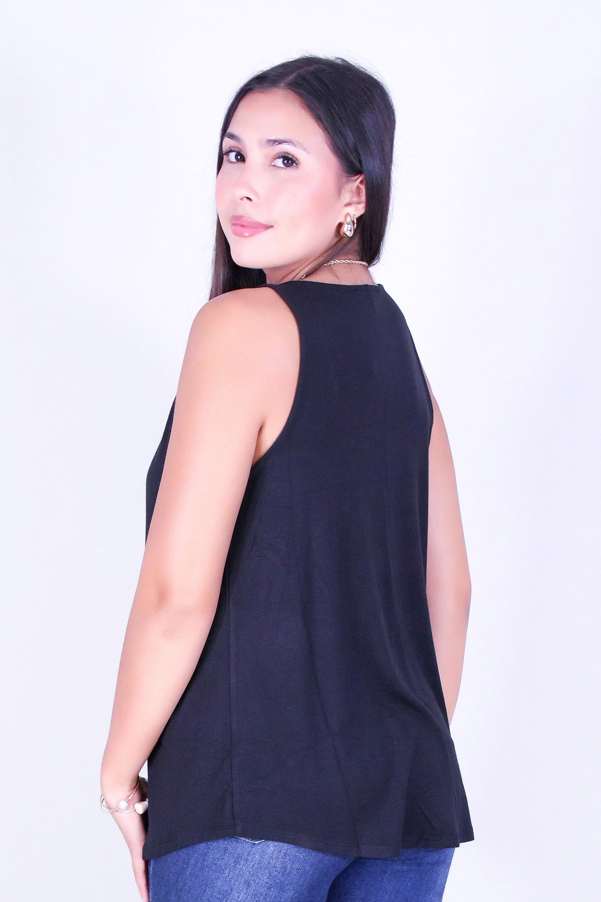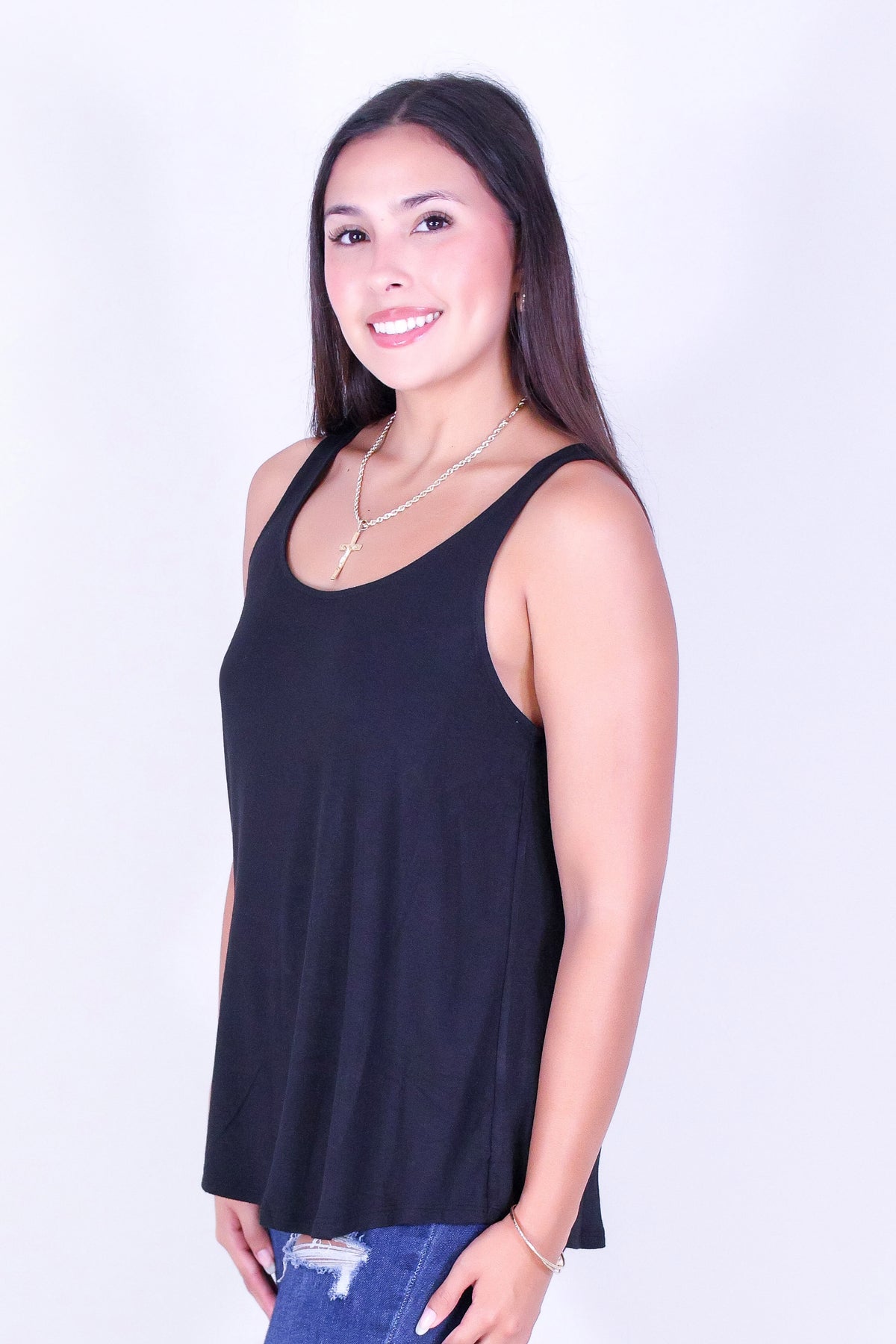 PETAL FLOW TANK TOP is available in color BLACK and in size SMALL, MED, LARGE.
