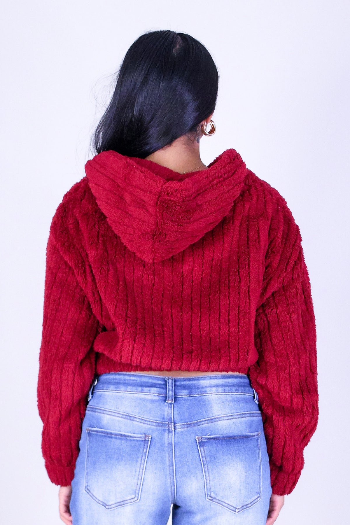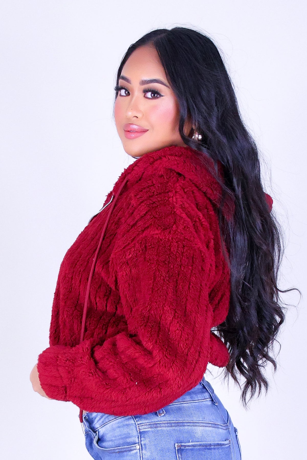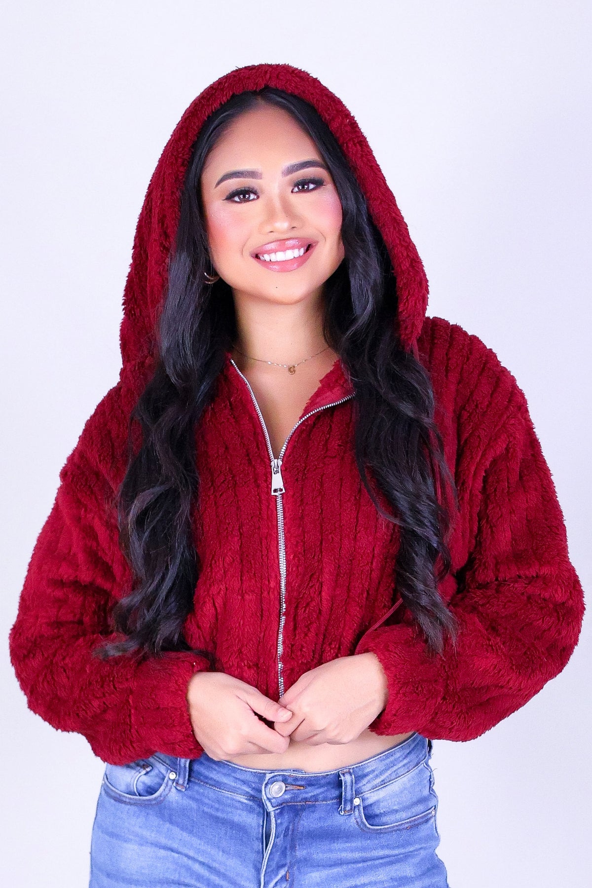 HONEY TEDDY JACKET is available in color BURGUNDY and in size SMALL, MED, LARGE.