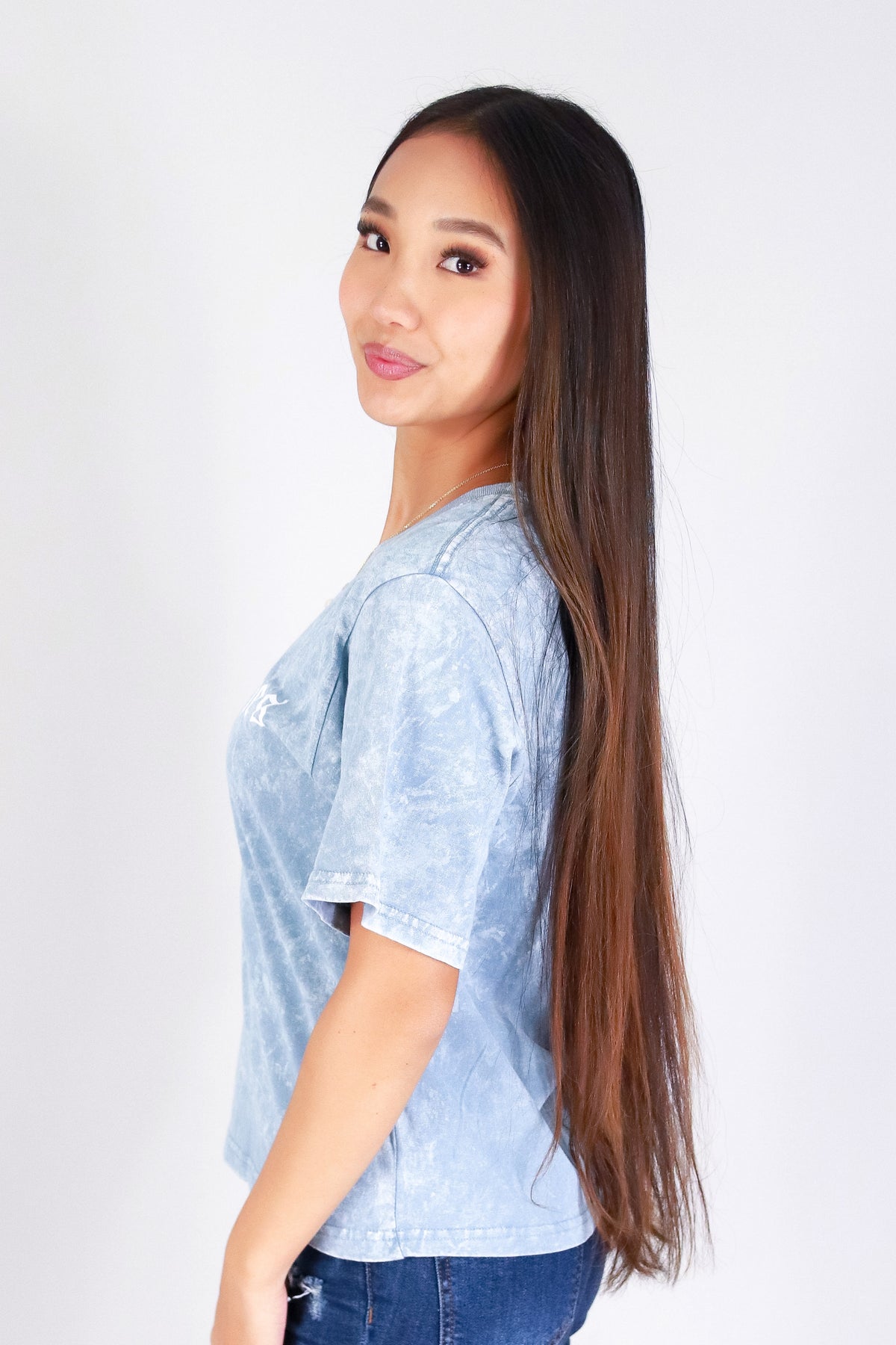 ALOHA BITCHES CROP TEE is available in color DENIM and in size SMALL, MED, LARGE, XL.