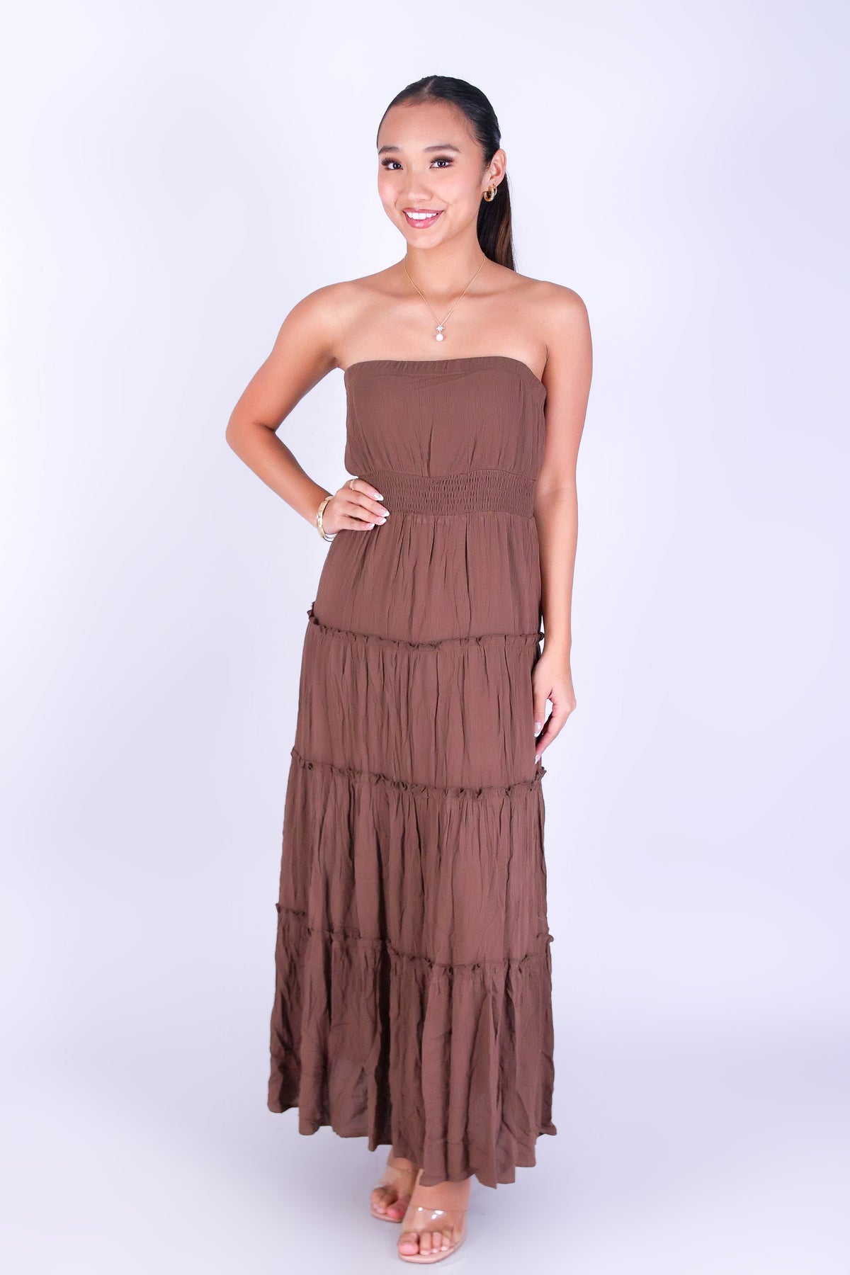 DAYDREAM GLOW TUBE DRESS is available in color BROWN and in size SMALL, MED, LARGE.