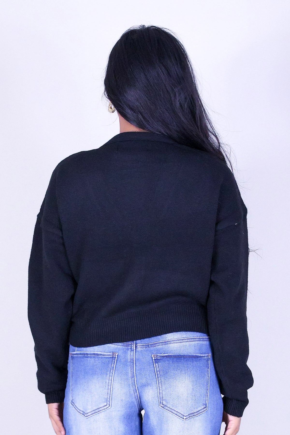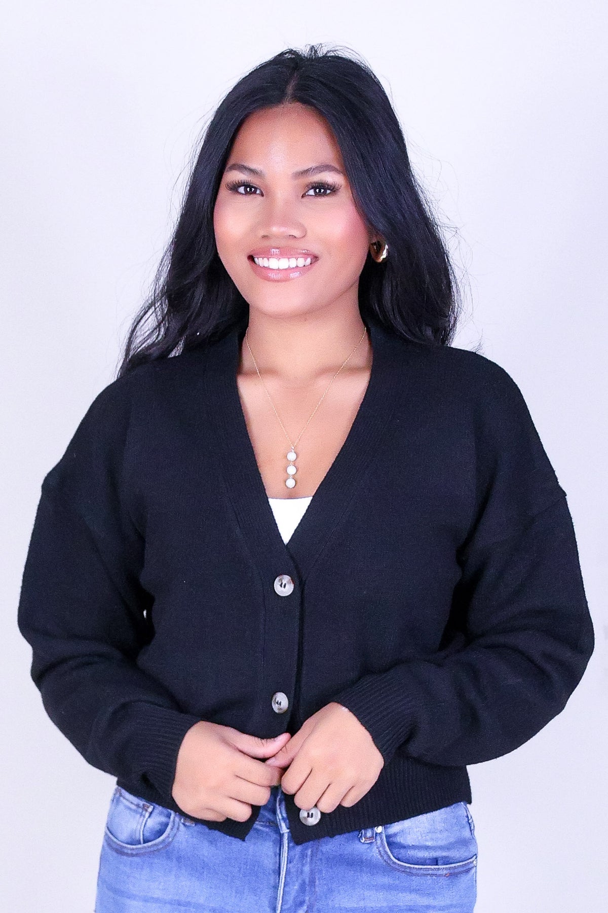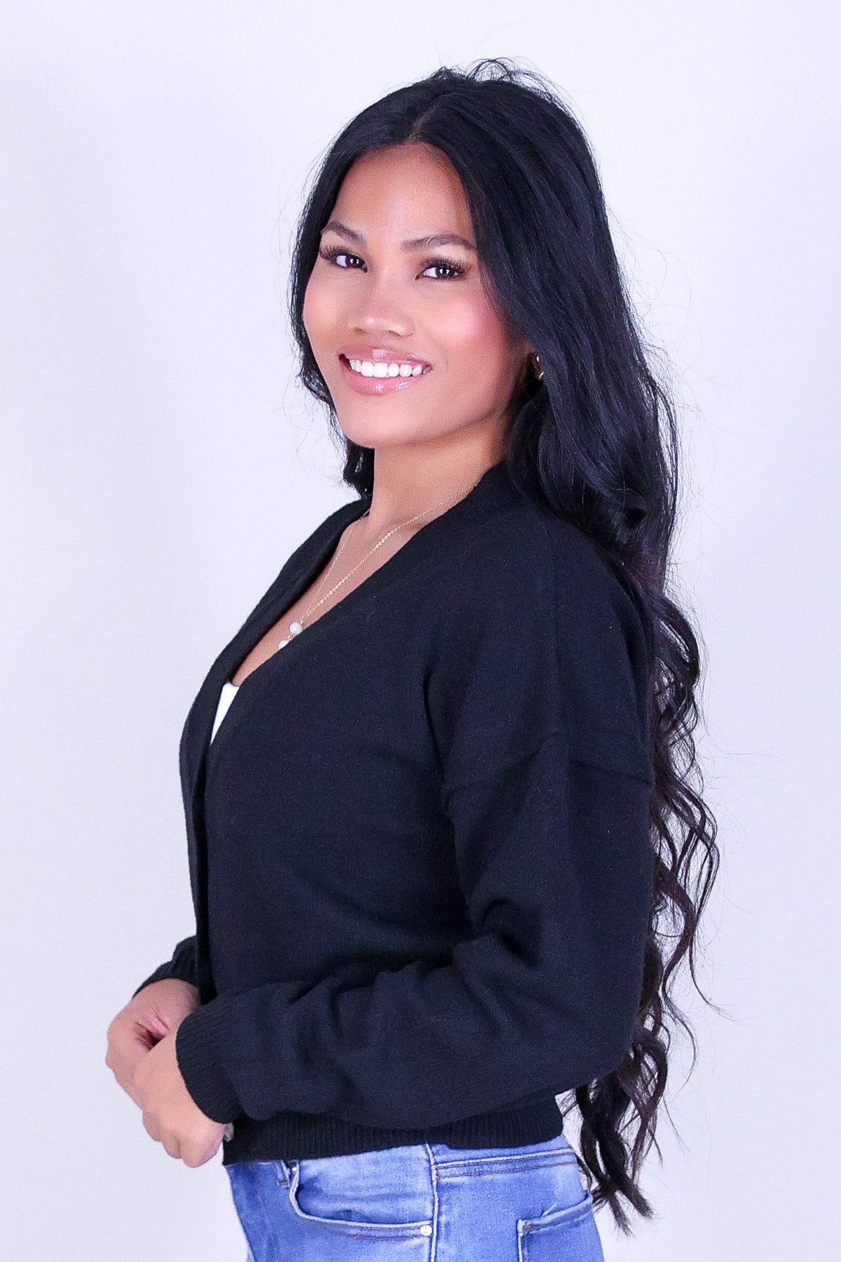 COMFY LAYER SWEATER CARDIGAN is available in color BLACK and in size SMALL, MED, LARGE.
