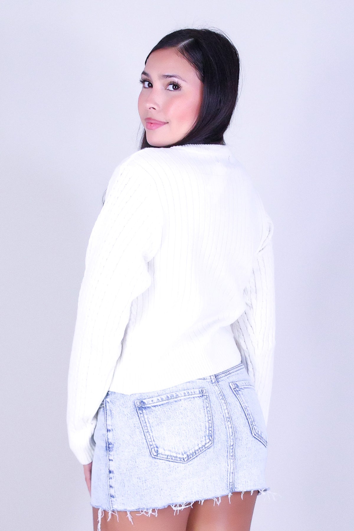 DARLING KNIT CARDIGAN is available in color IVORY and in size SMALL, MED, LARGE.