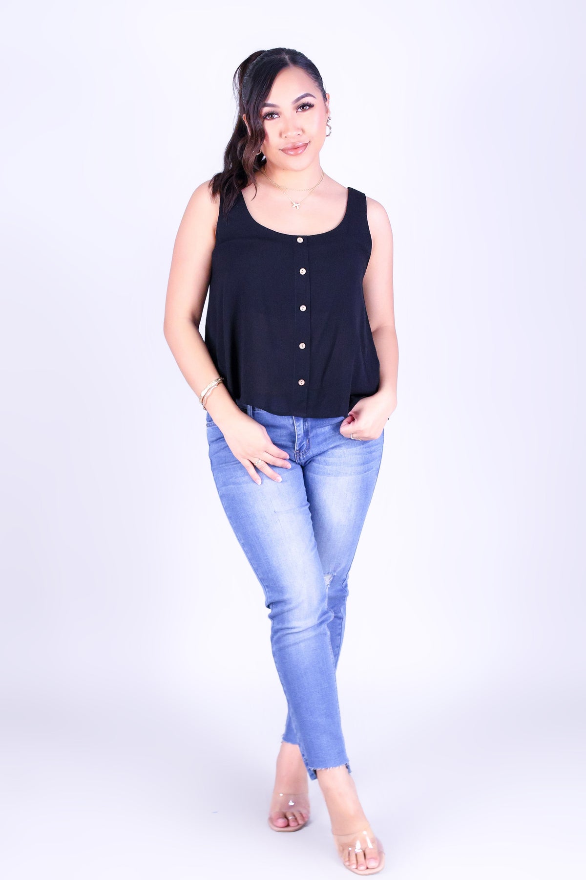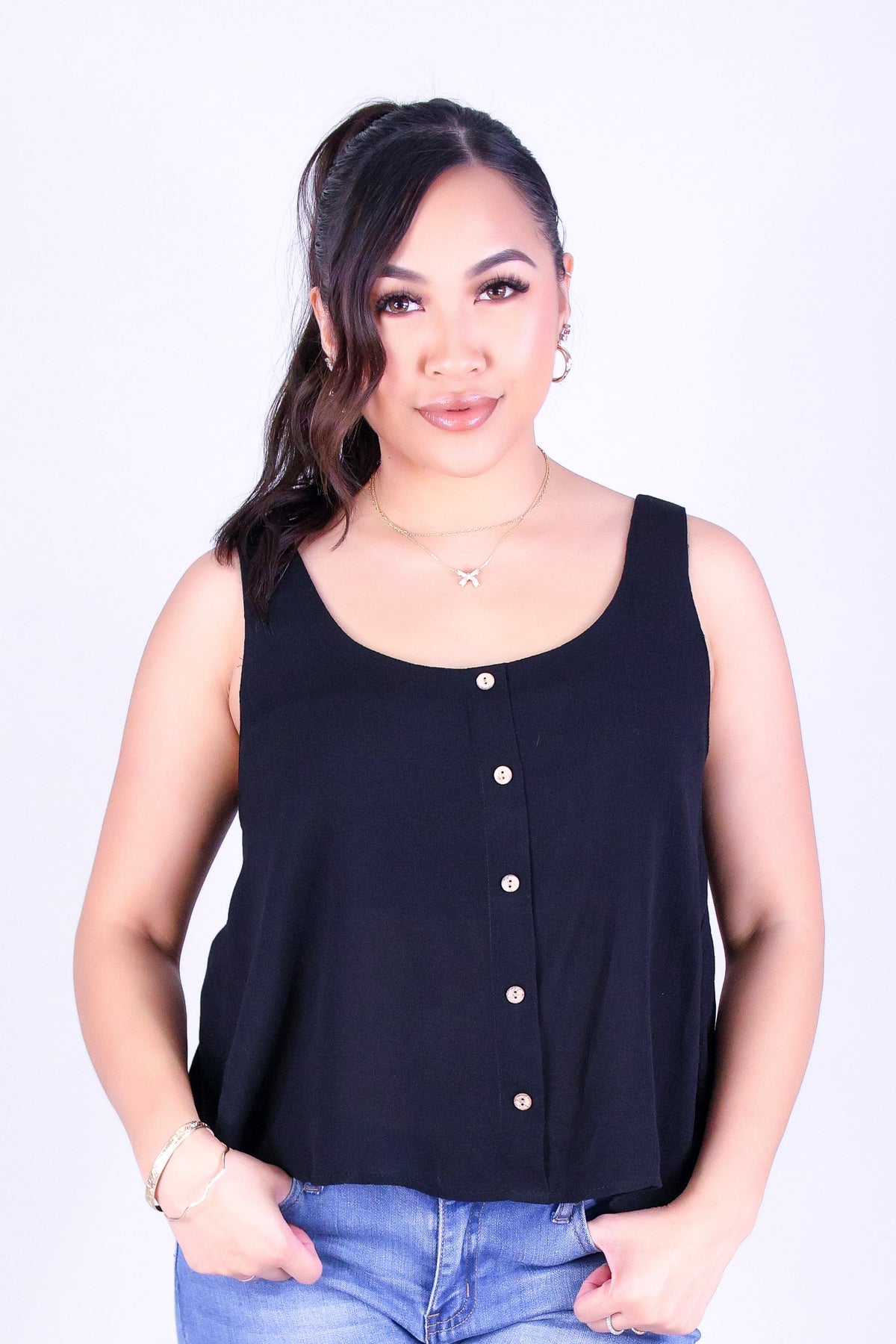 BUTTON ME UP TOP is available in color BLACK and in size SMALL, MED, LARGE.