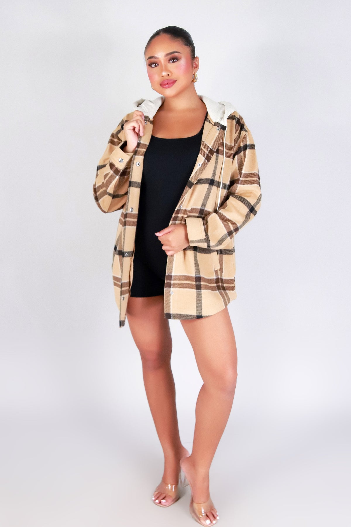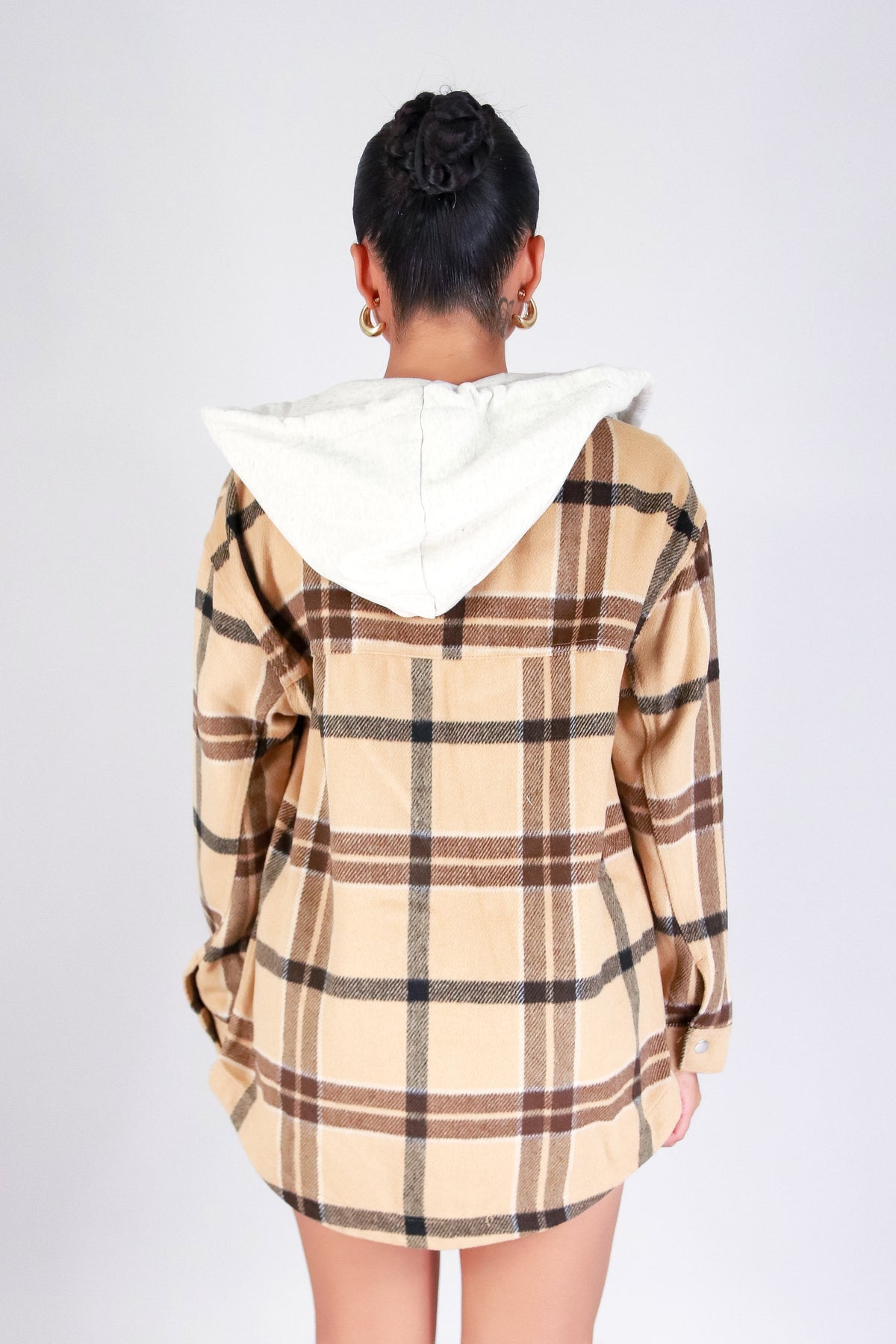 EVERYDAY COZY PLAID SHACKET is available in color Camel and in size SMALL, MED, LARGE.