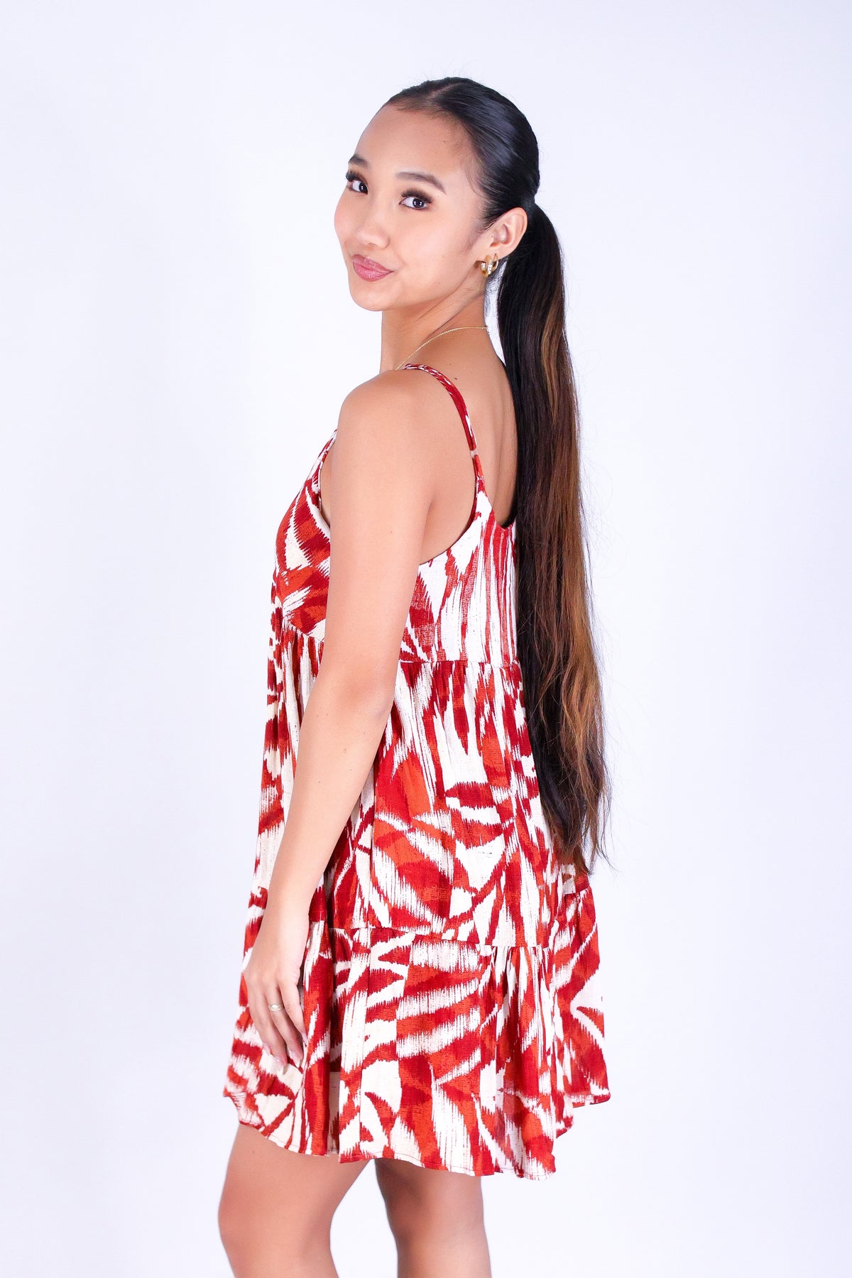 WATERCOLOR PARADISE TIERED BABYDOLL DRESS is available in color RUST and in size SMALL, MED, LARGE, XL.