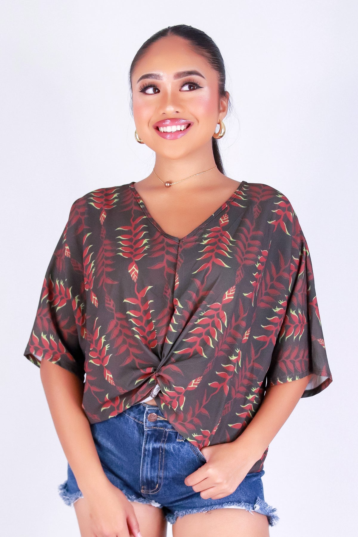 HELICONIA TWIST BOTTOM TOP is available in color BROWN and in size SMALL, MED, LARGE, XL.