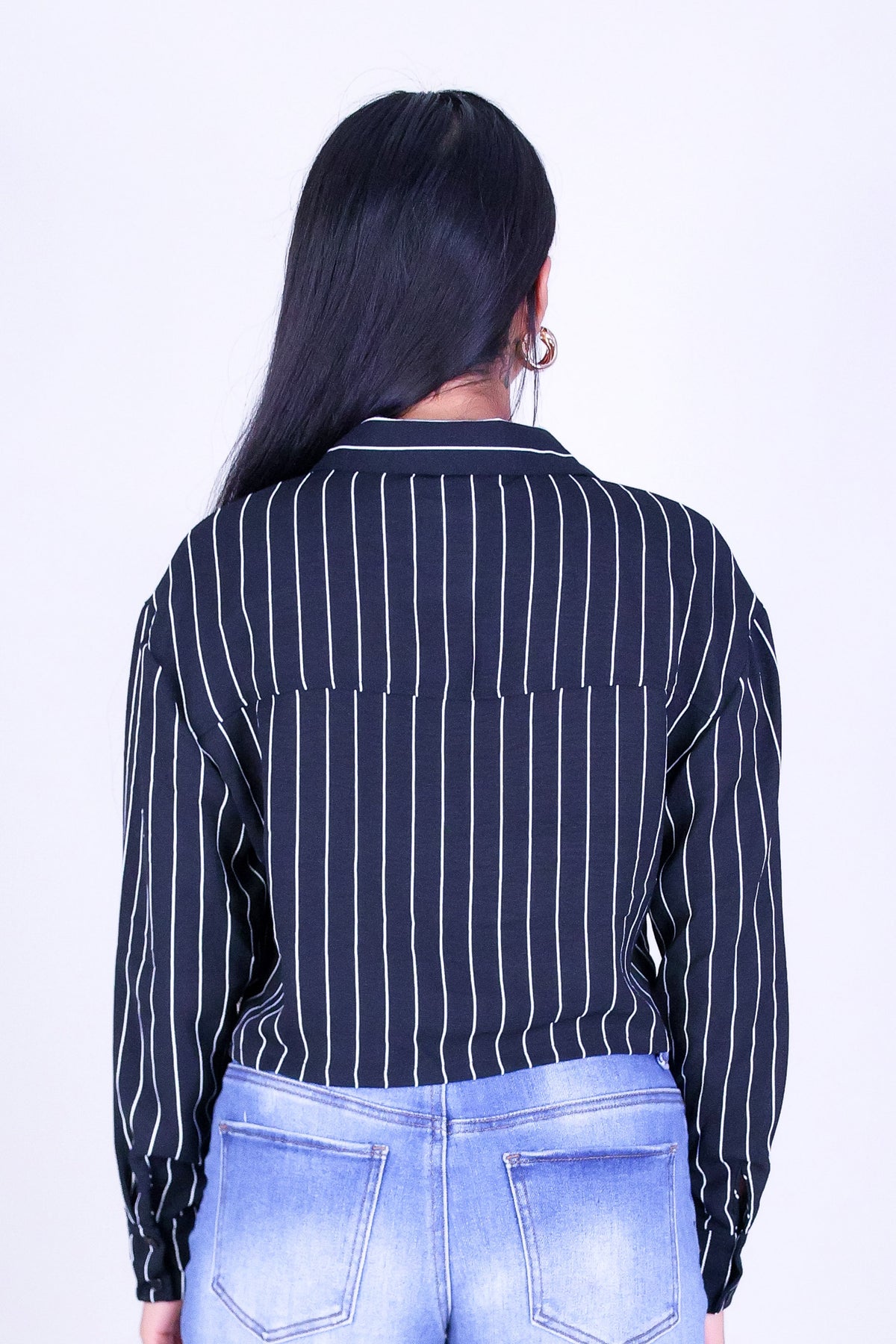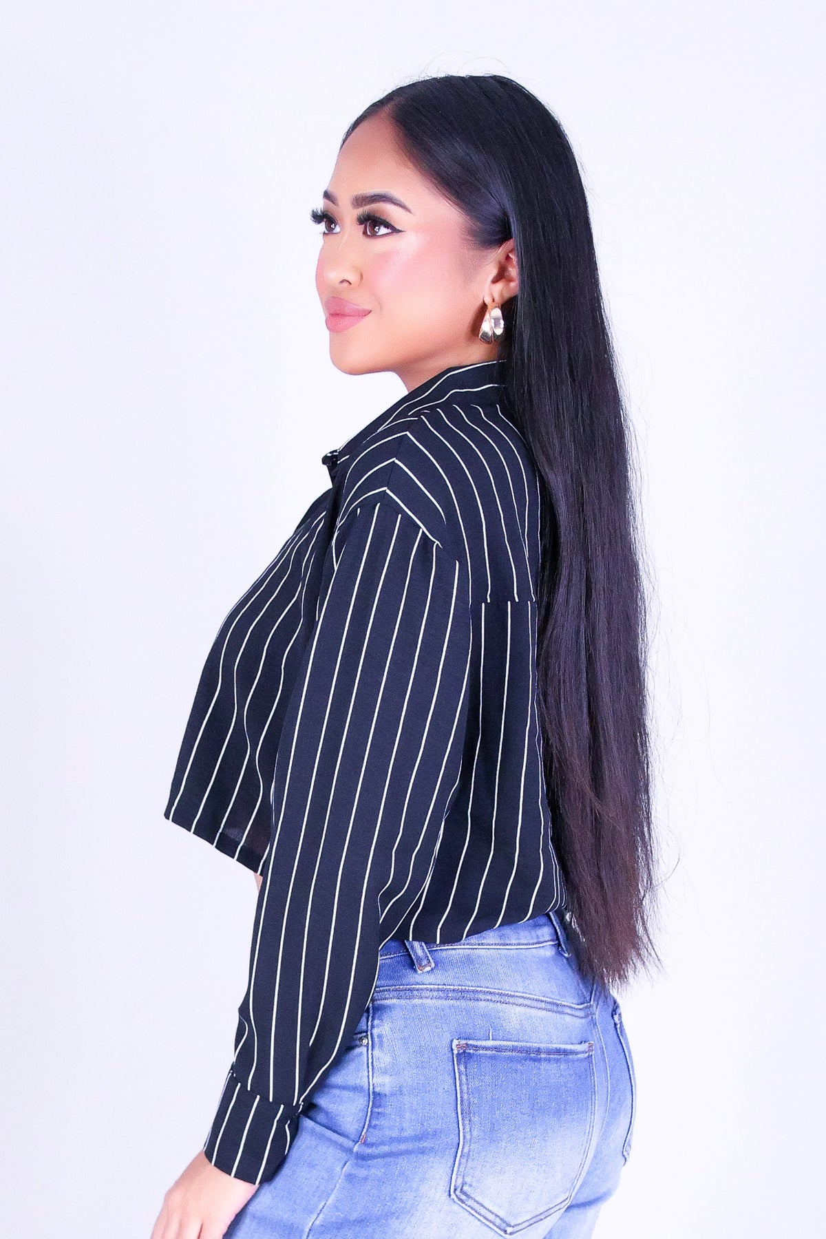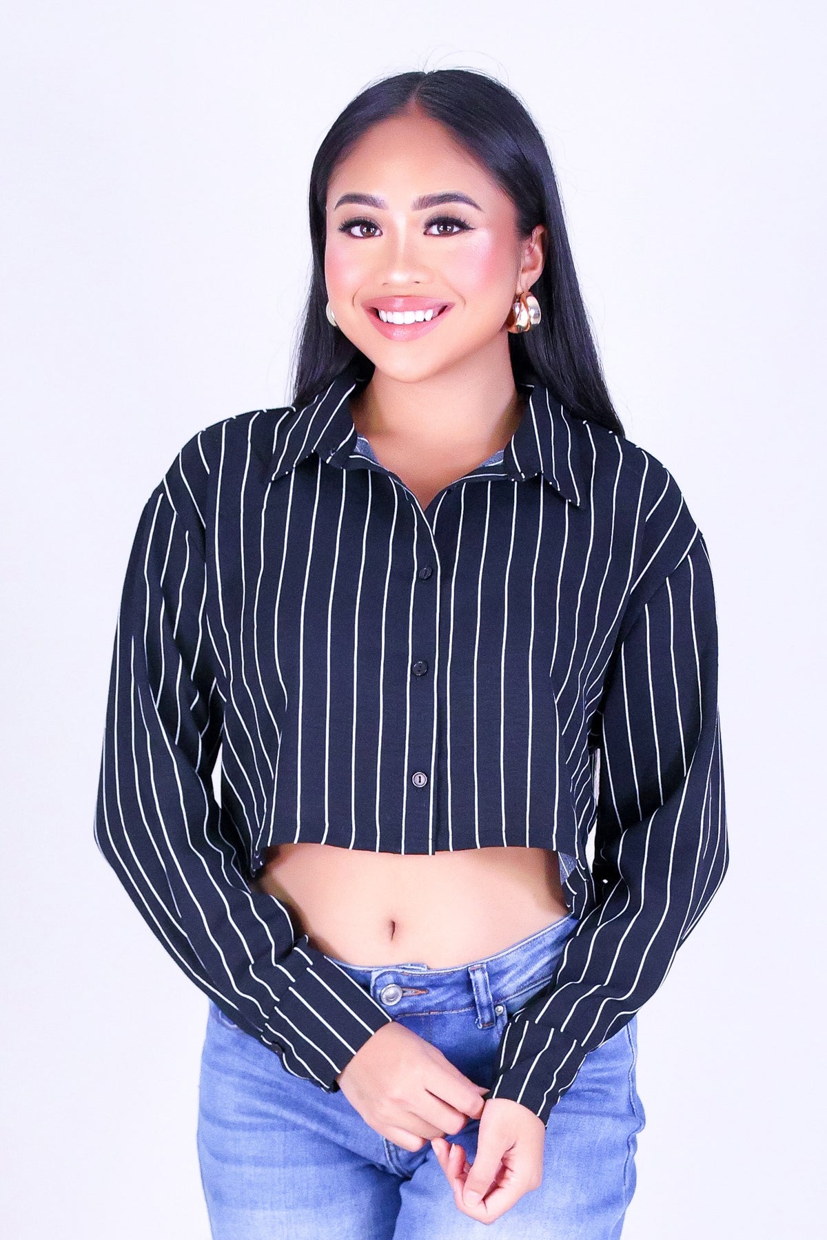CITY STRIPE LONG SLEEVE CROP TOP is available in color BLACK and in size SMALL, MED, LARGE.