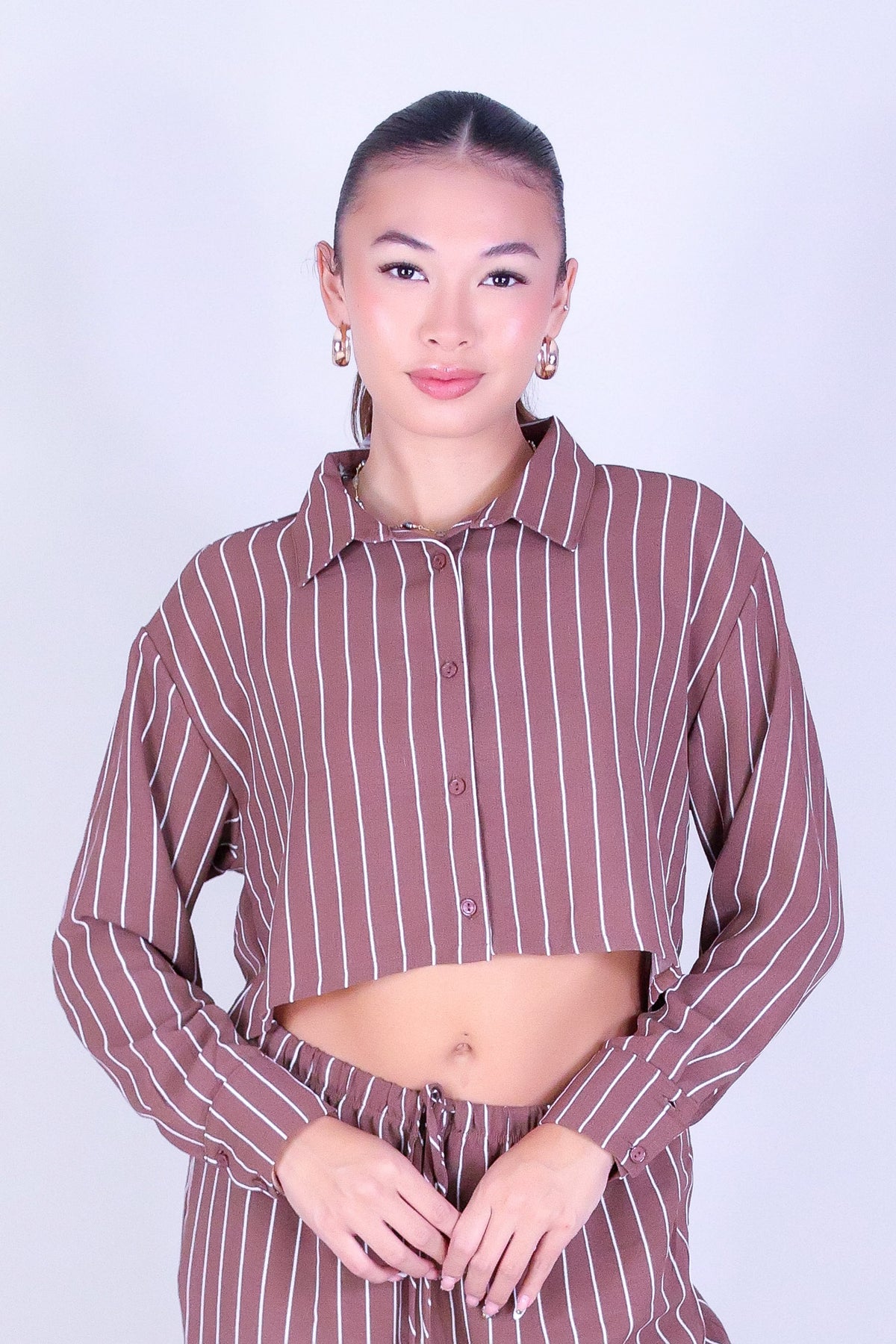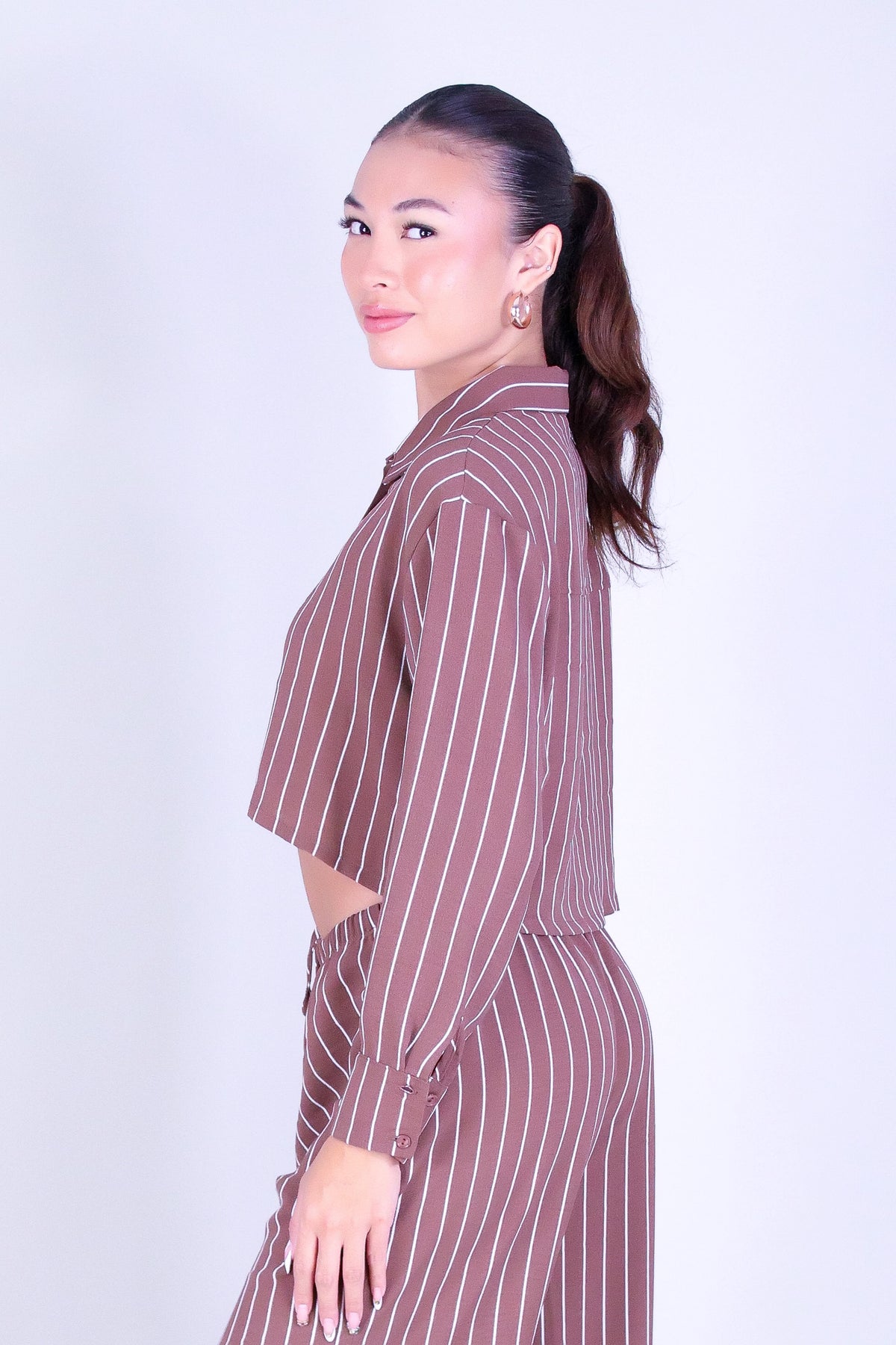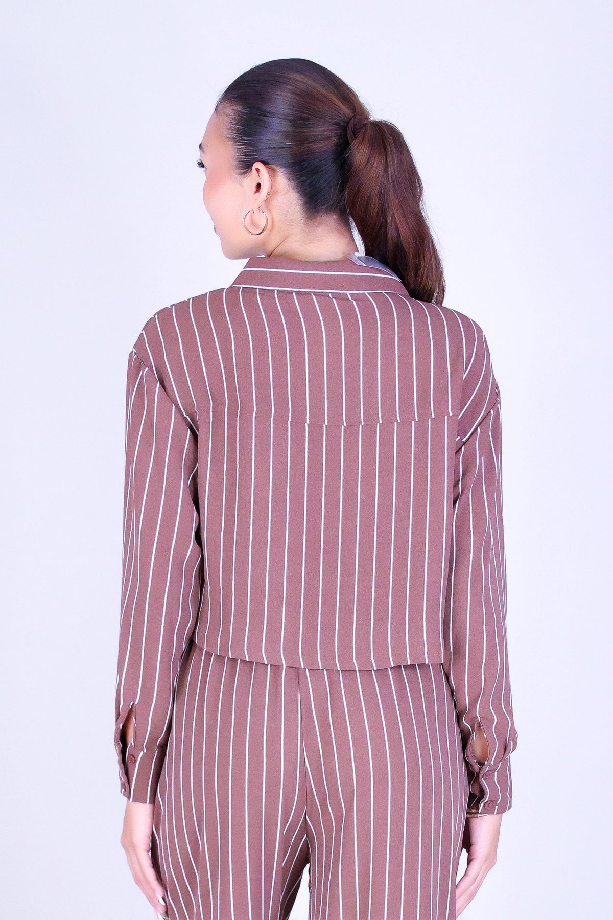 CITY STRIPE LONG SLEEVE CROP TOP is available in color BROWN and in size SMALL, MED, LARGE.