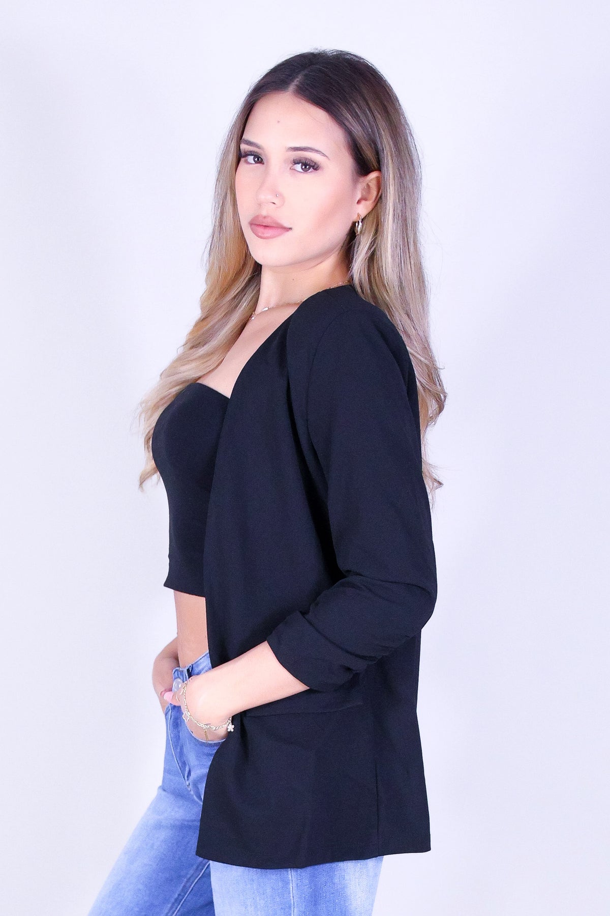 SHARP EDIT BLAZER is available in color BLACK and in size SMALL, MED, LARGE.