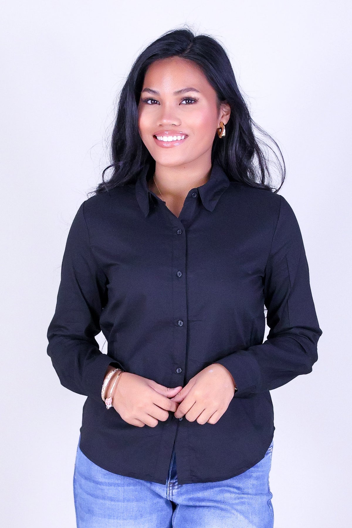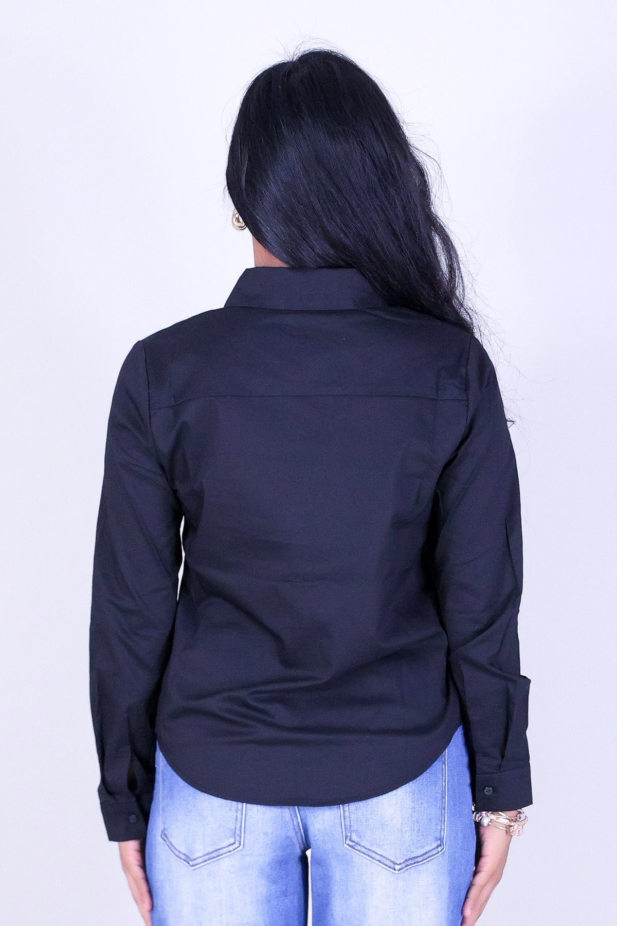 MODERN PRESS BUTTON-DOWN TOP is available in color BLACK and in size SMALL, MED, LARGE.