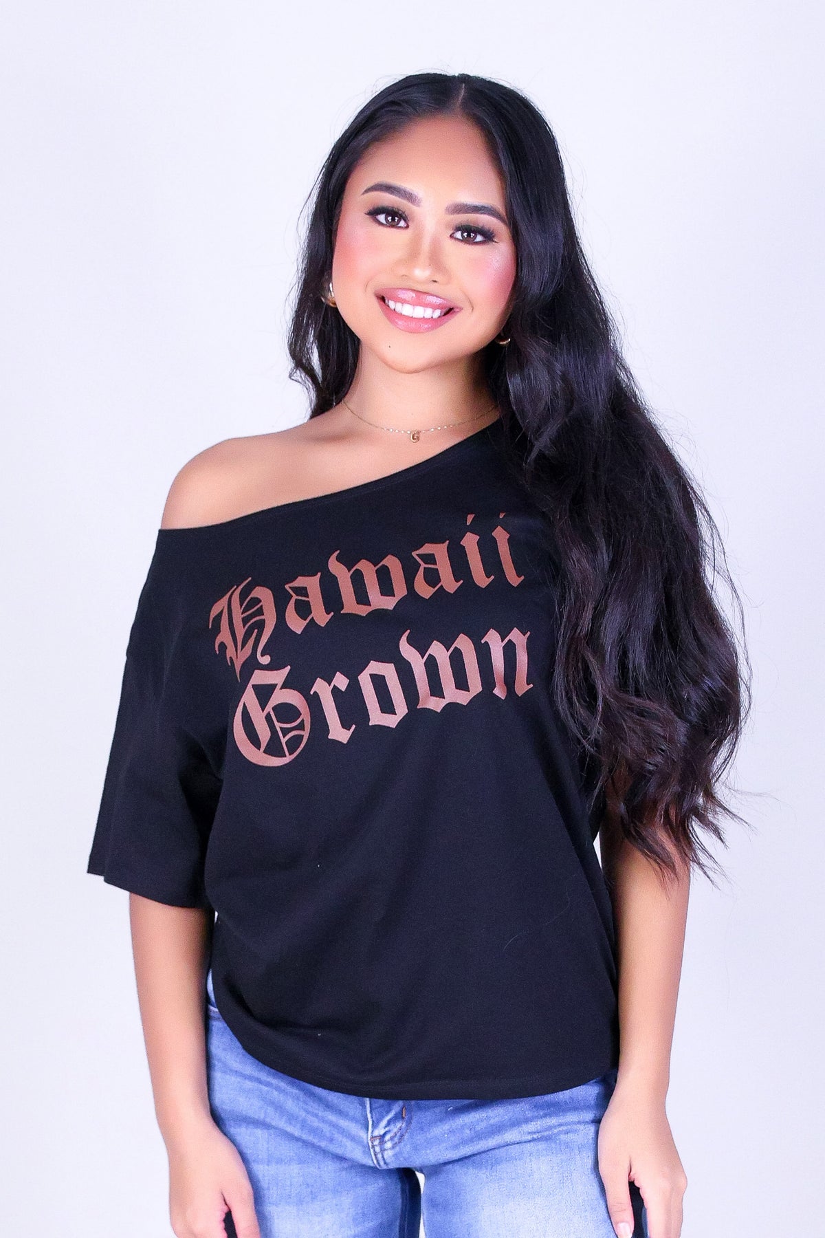 HAWAII GROWN TEE is available in color BLACK and in size XS, SMALL, MED, LARGE, XL.
