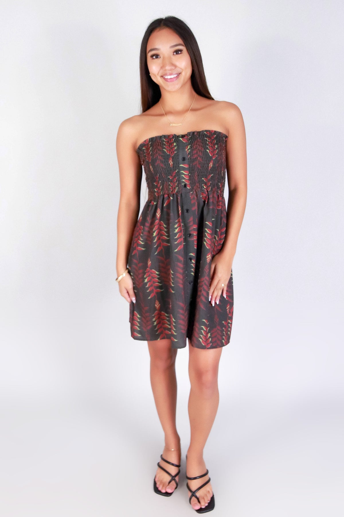 HELICONIA SMOCKED BABYDOLL DRESS is available in color BROWN and in size SMALL, MED, LARGE, XL.