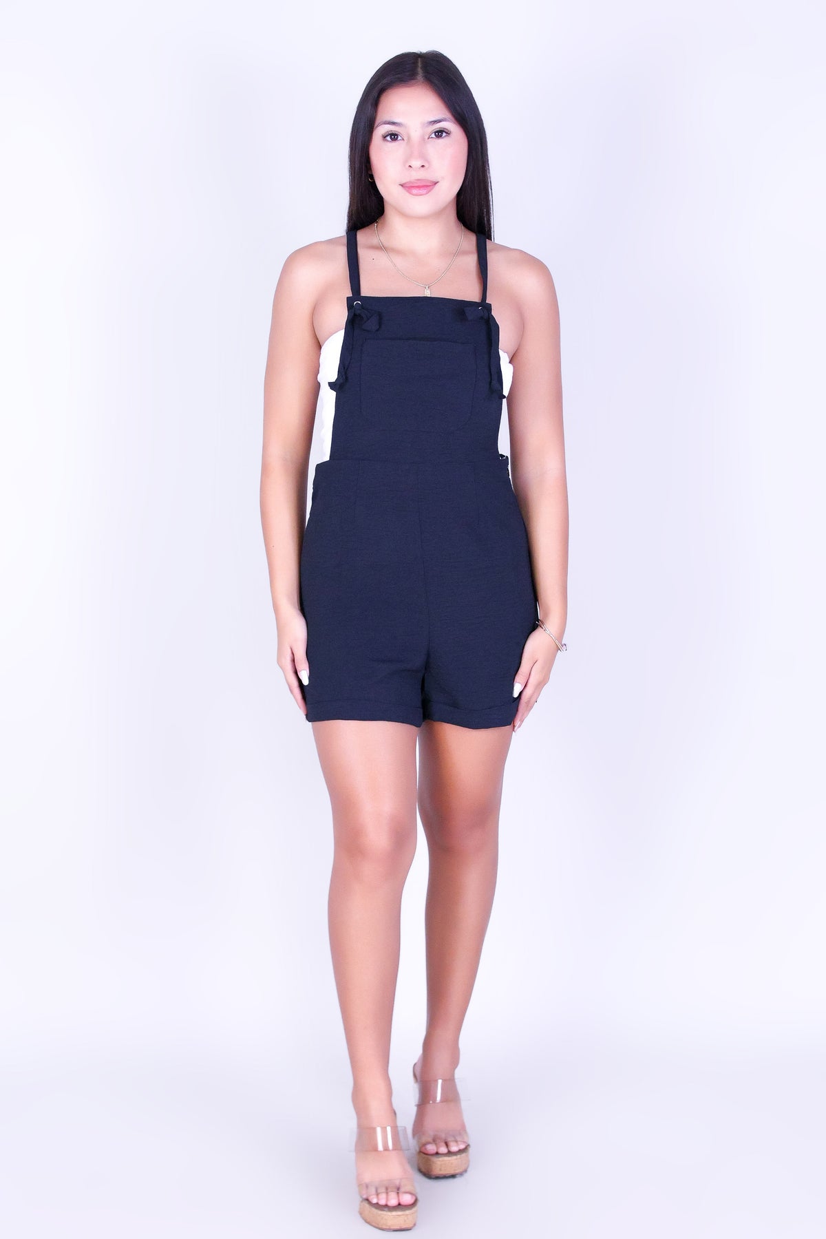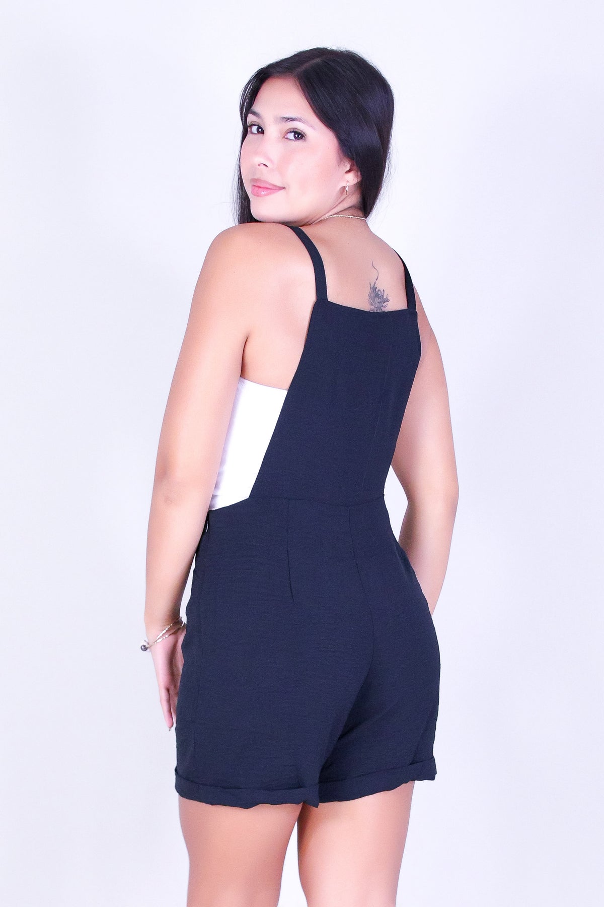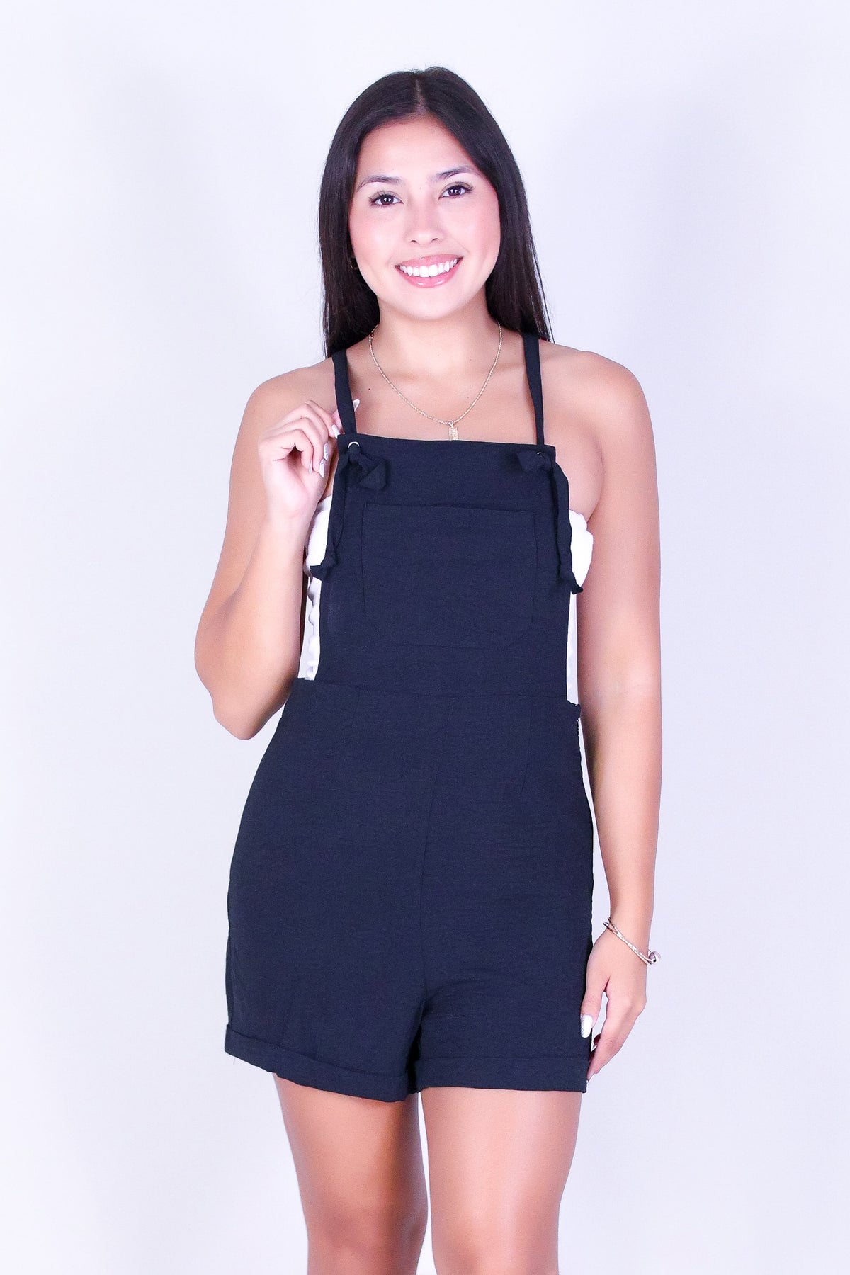 PRETTY PLAY SHORTALL ROMPER is available in color BLACK and in size SMALL, MED, LARGE.