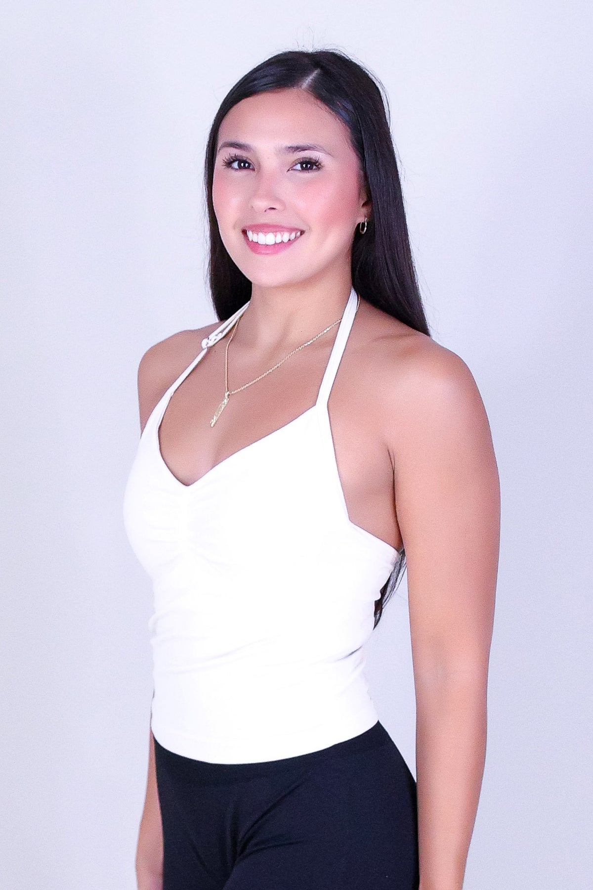 PRETTY FIT HALTER TOP is available in color CREAM and in size SMALL, MED, LARGE.