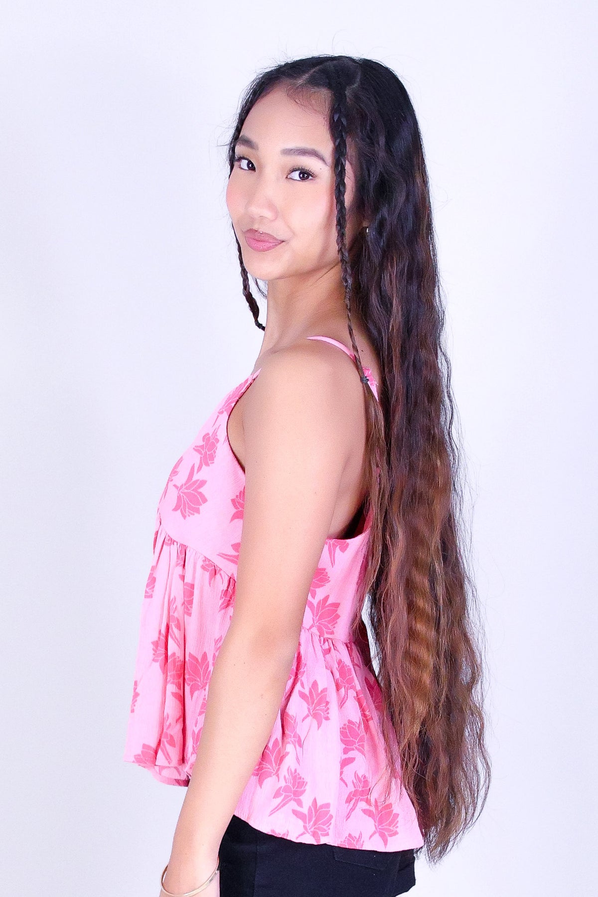 TUBEROSE BABYDOLL TOP is available in color PINK and in size SMALL, MED, LARGE.