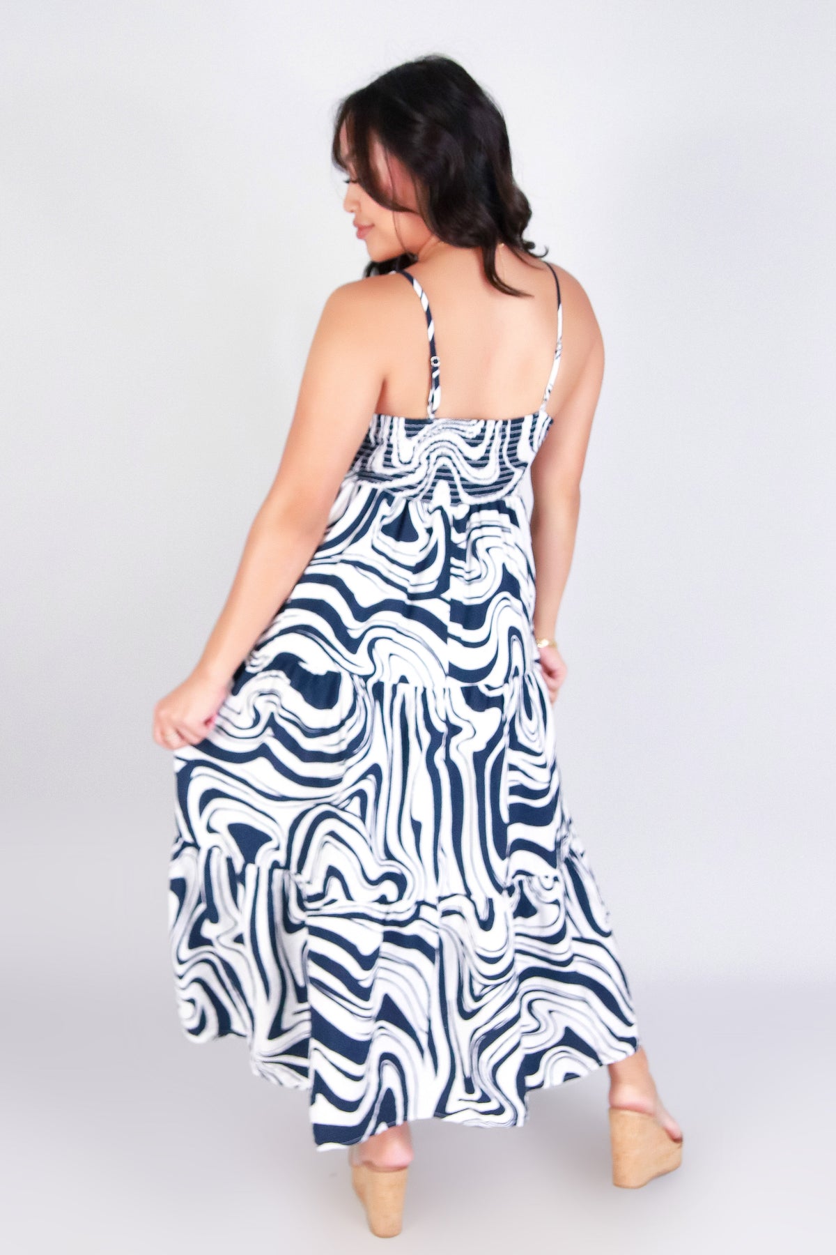 MEADOW TWIRL MIDI DRESS is available in color NAVY and in size SMALL, MED, LARGE.