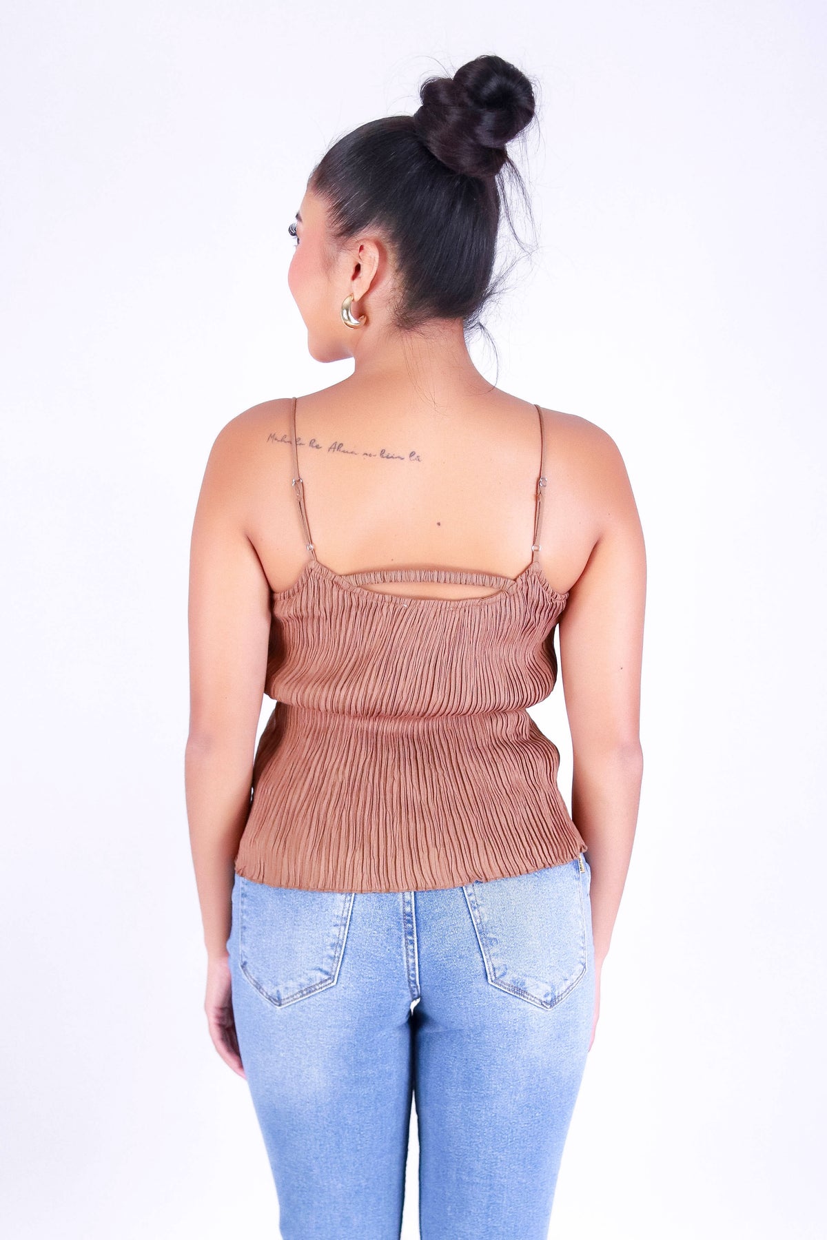 CUTIE ON THE GO TOP is available in color LT. BROWN and in size SMALL, MED, LARGE.