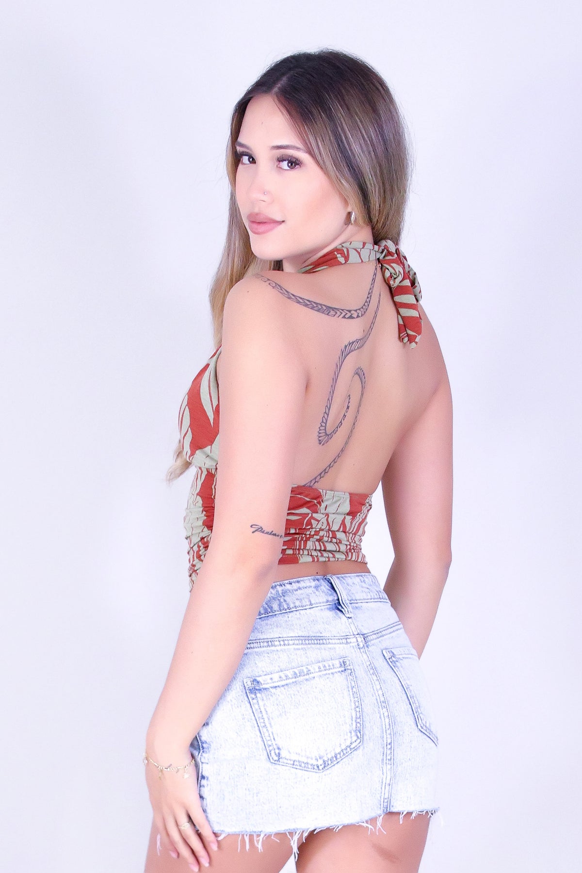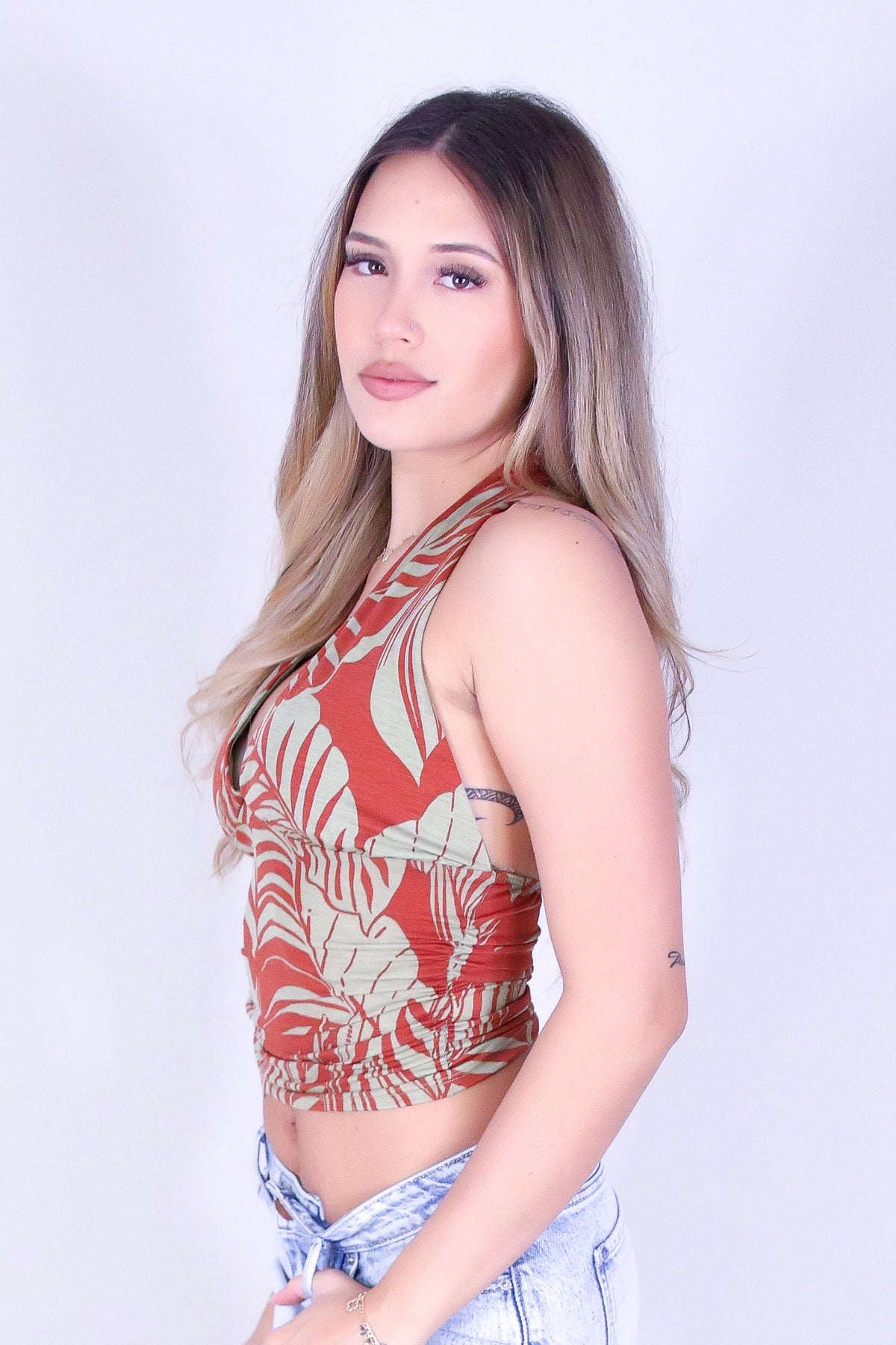TROPICAL MUSE HALTER TOP is available in color GREEN and in size SMALL, MED, LARGE.
