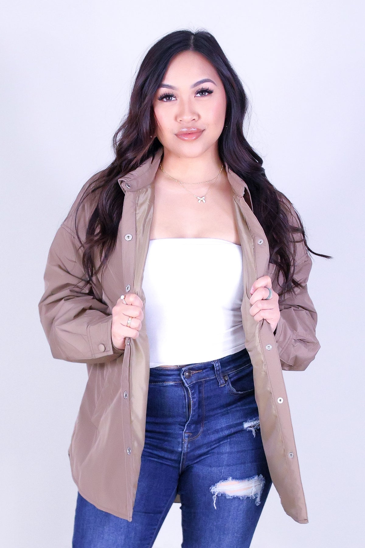 TALK TO ME PUFFER JACKET is available in color MOCHA and in size SMALL, MED, LARGE.
