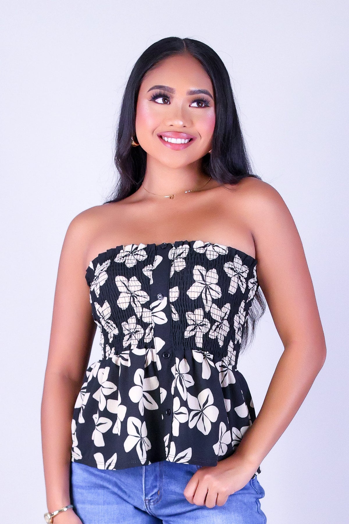 PLUMERIA SMOCKED TUBE TOP is available in color BLACK and in size SMALL, MED, LARGE.