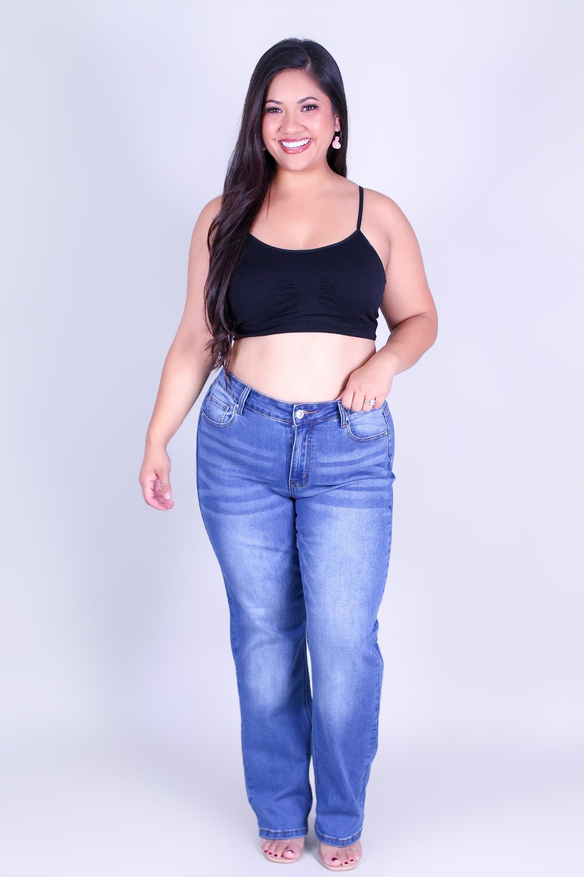 IN THE FEELS DENIM JEANS is available in color MED S/W and in size 14, 16, 18.