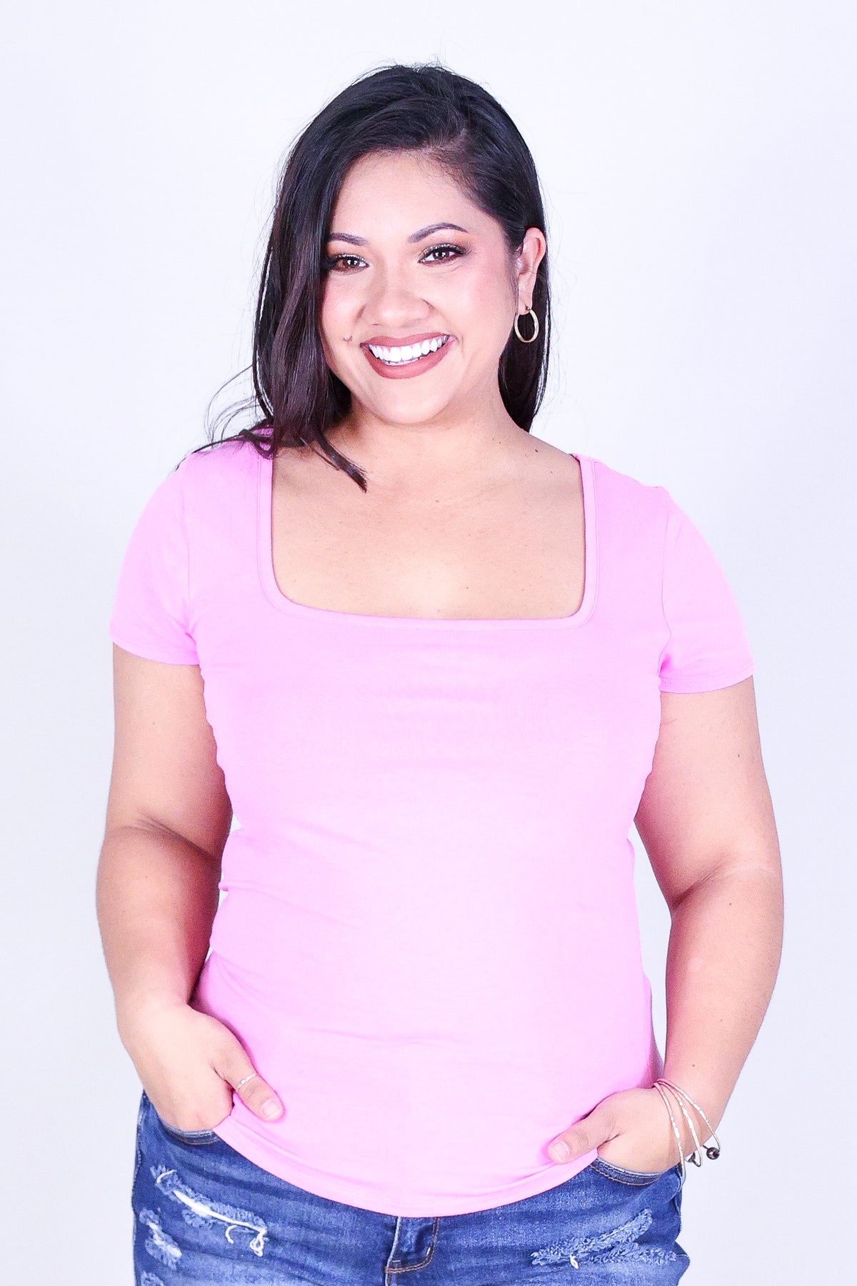 PRETTY ESSENTIAL TEE is available in color LT. PINK and in size 1X, 2X, 3X.