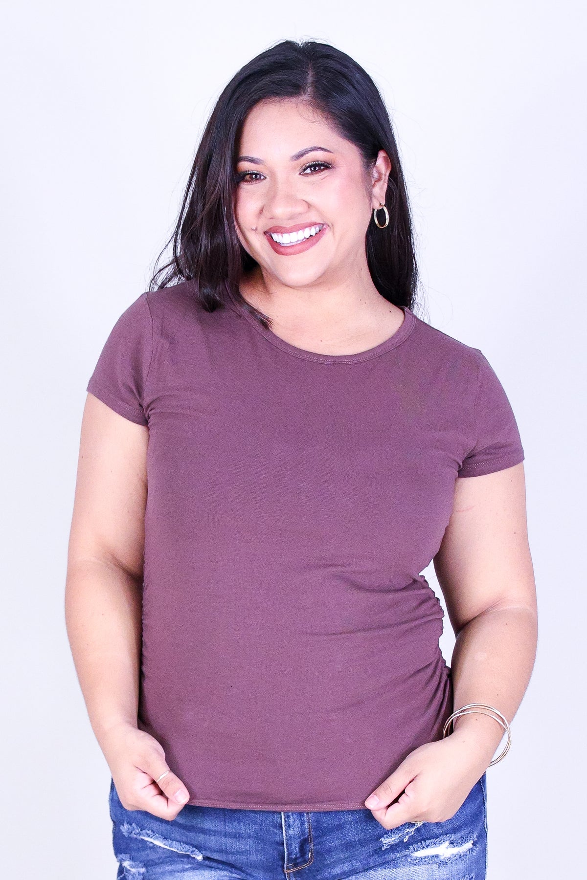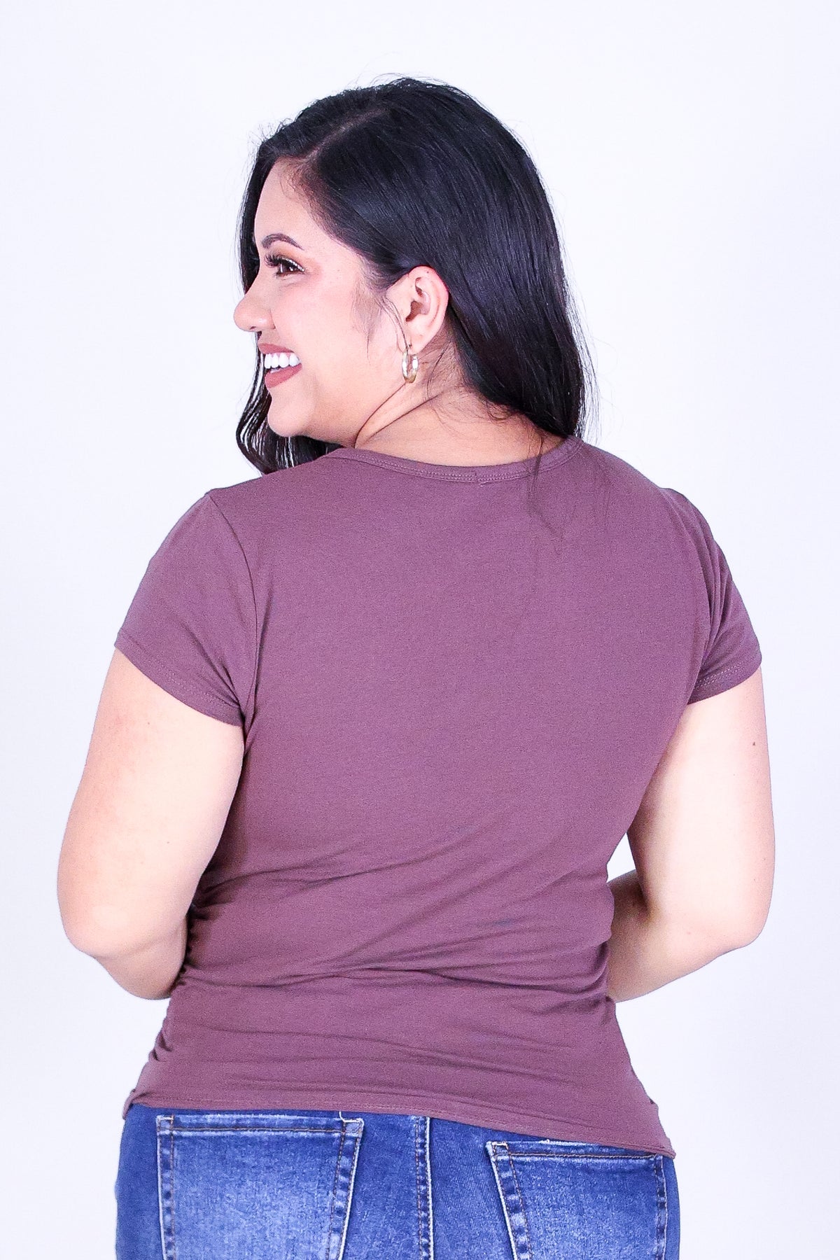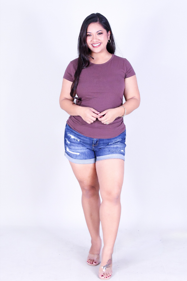 WEEKEND TEE is available in color CHOC and in size 1X, 2X, 3X.