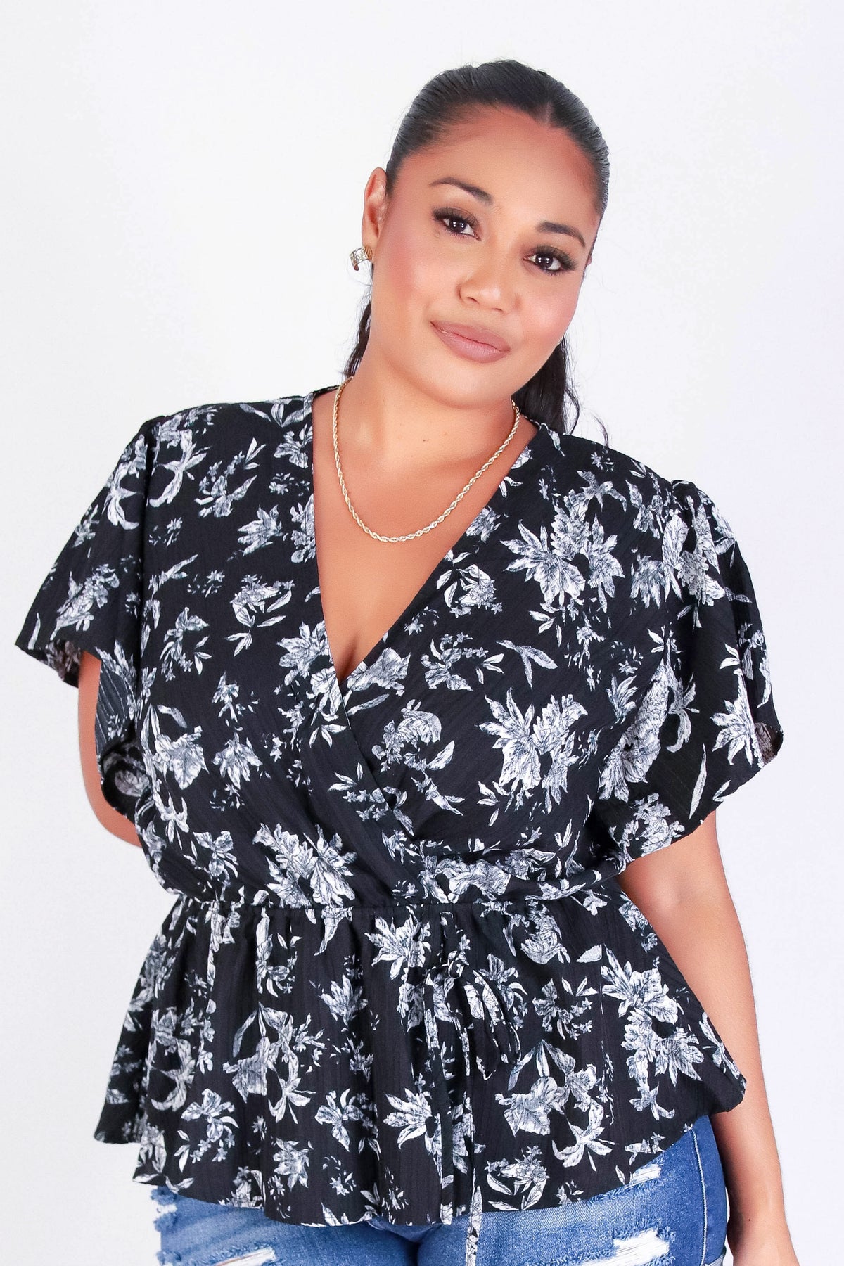FLORAL BREEZE TOP is available in color BLACK and in size 1X, 2X, 3X.