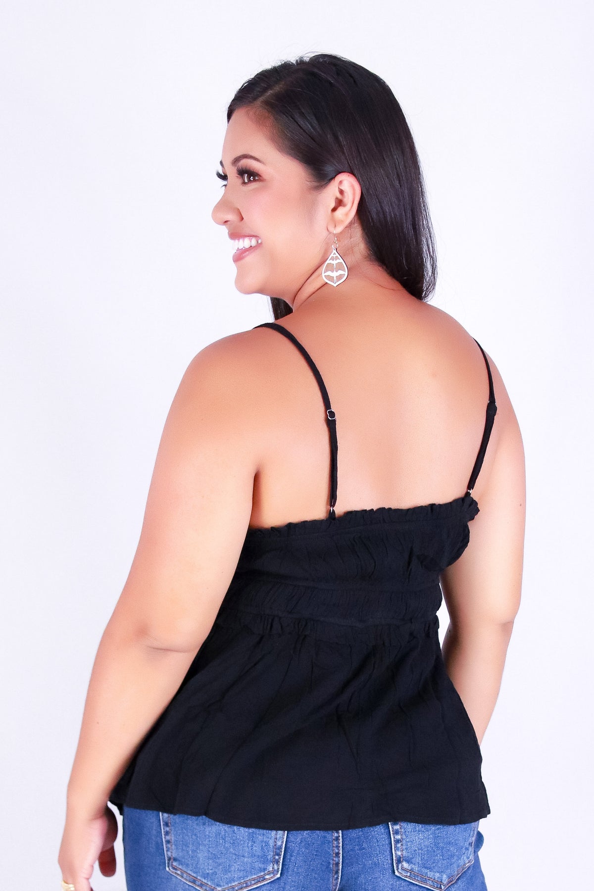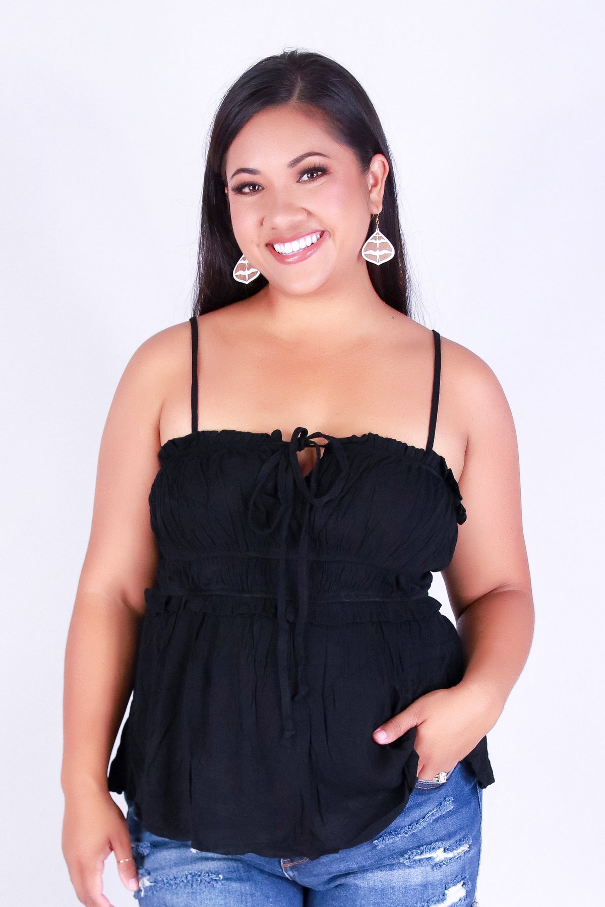 SWEET TIED THING TOP is available in color BLACK and in size 1X, 2X, 3X.