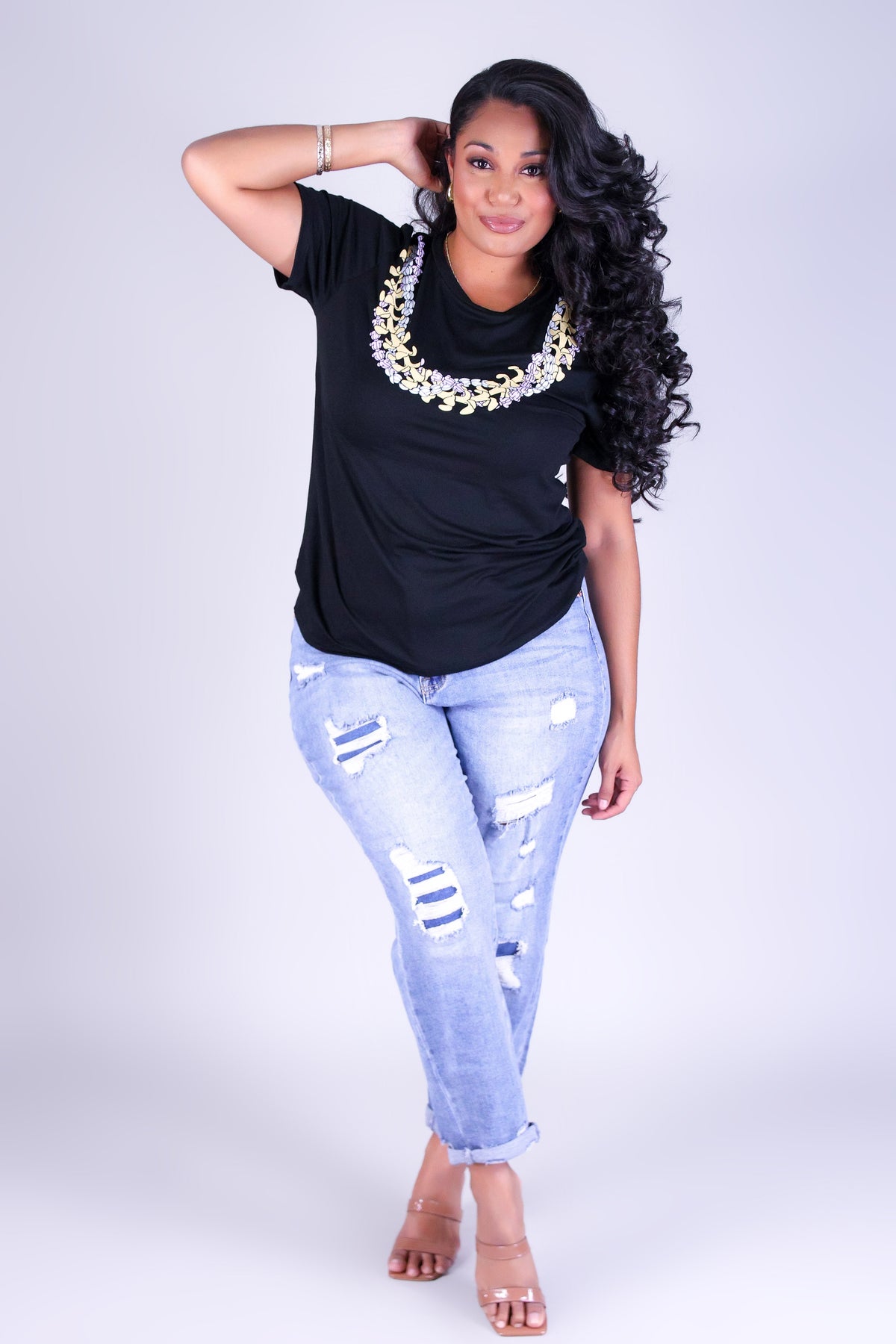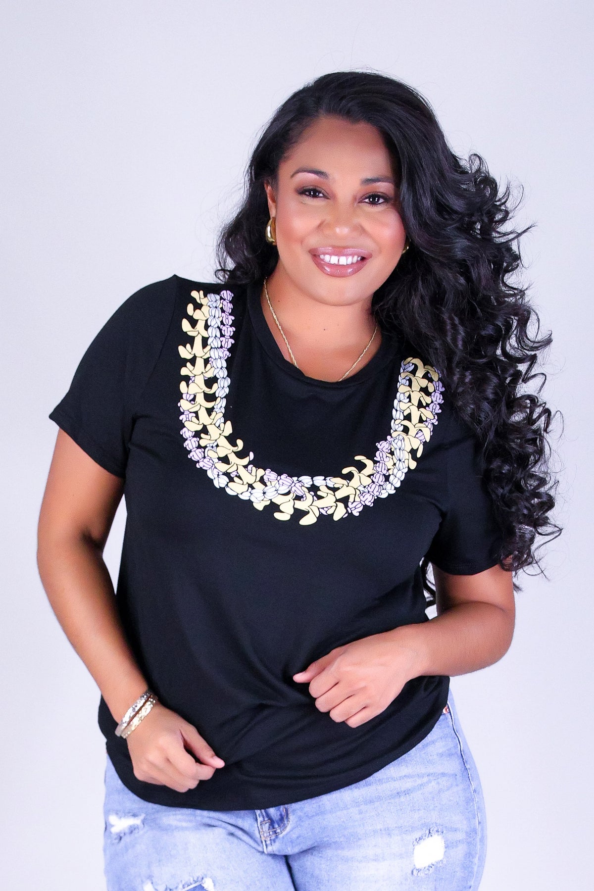 PUAKENIKENI PIKAKE MULTI LEI TEE is available in color BLACK and in size 1X, 2X, 3X.