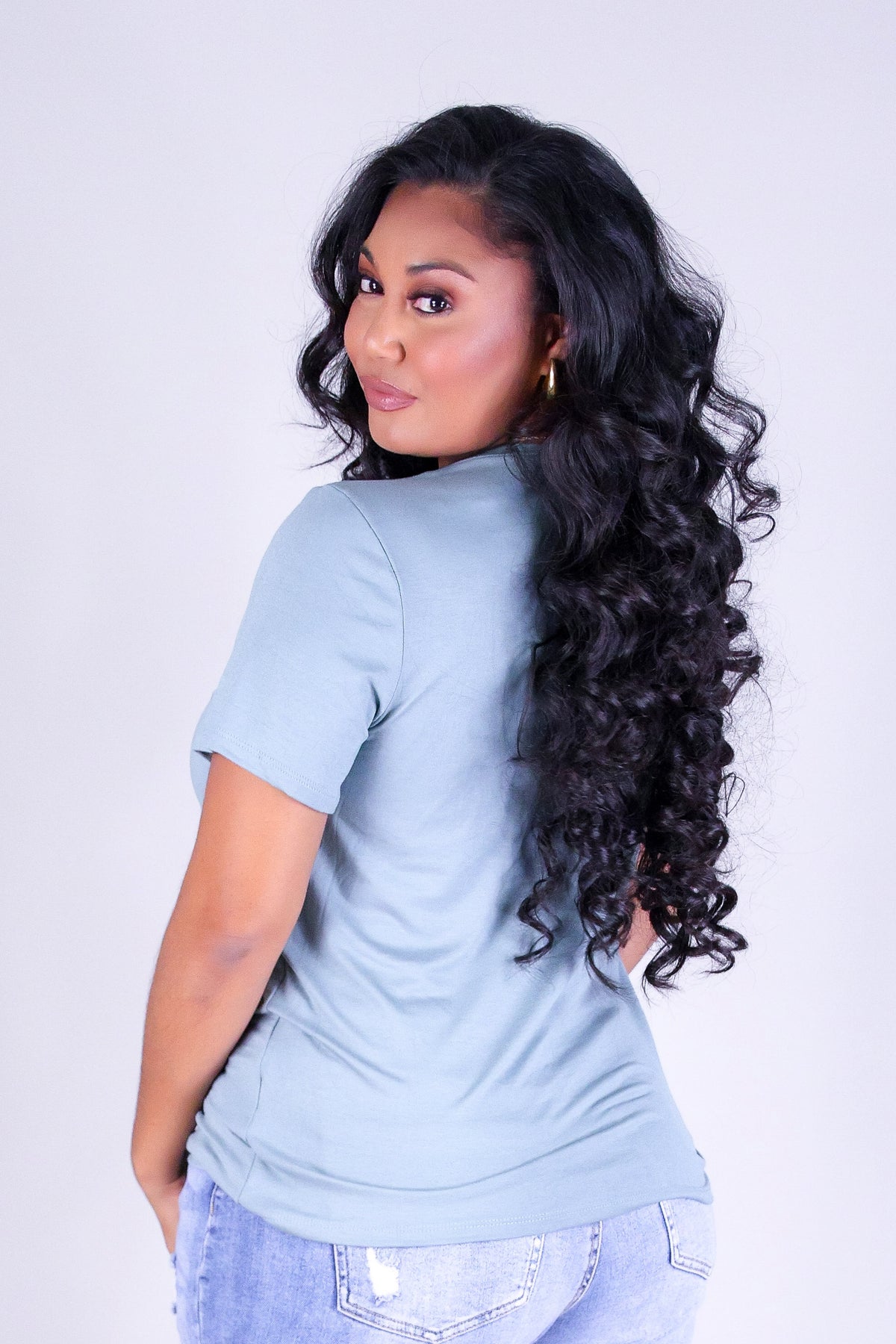 PUAKENIKENI PIKAKE MULTI LEI TEE is available in color SAGE and in size 1X, 2X, 3X.