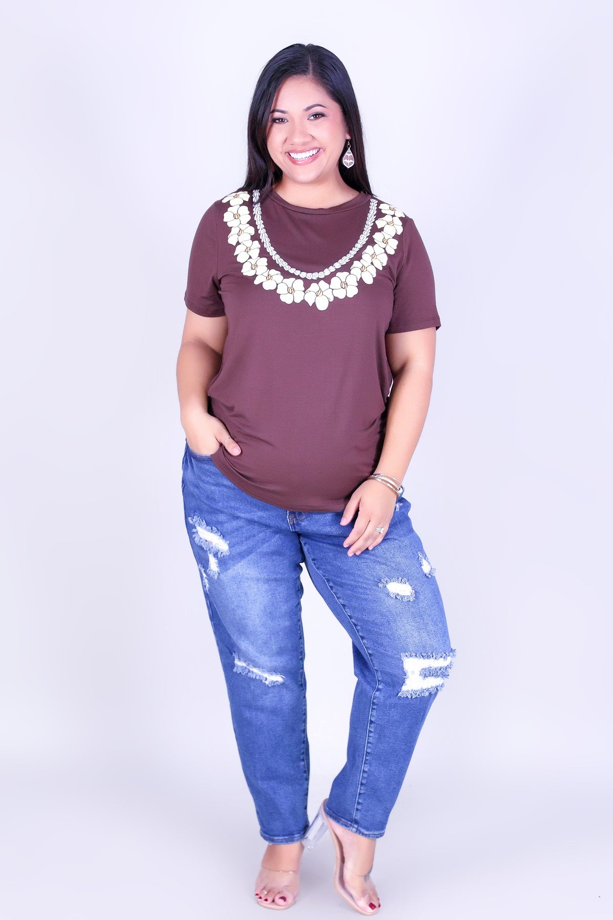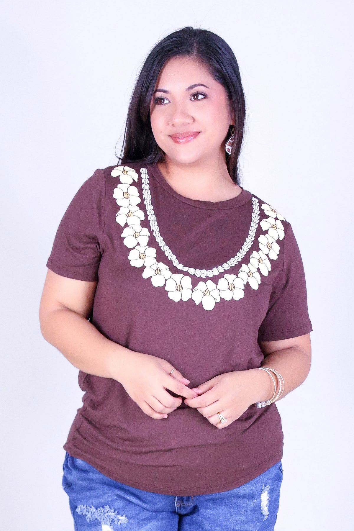 PIKAKE FRONT PUAKENIKENI LEI TEE is available in color BROWN and in size 1X, 2X, 3X.
