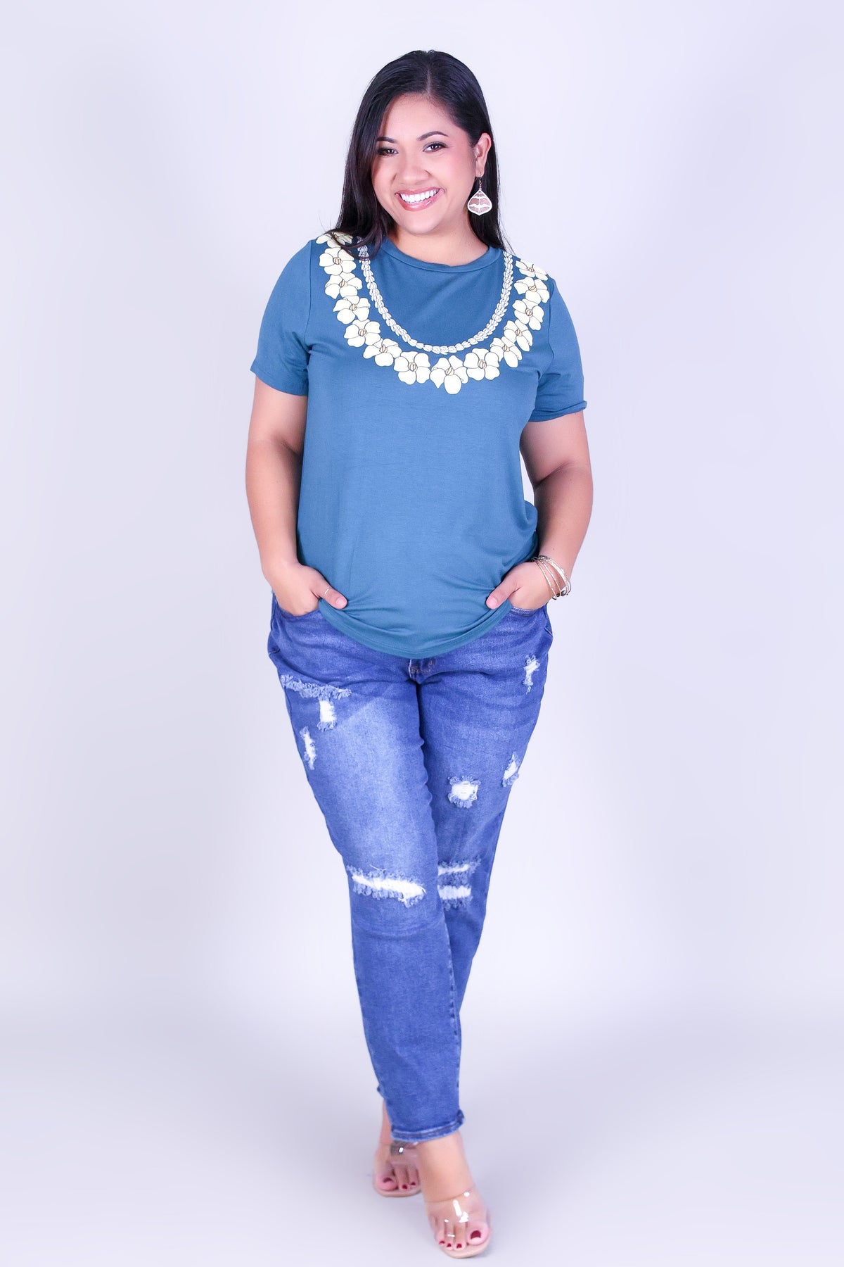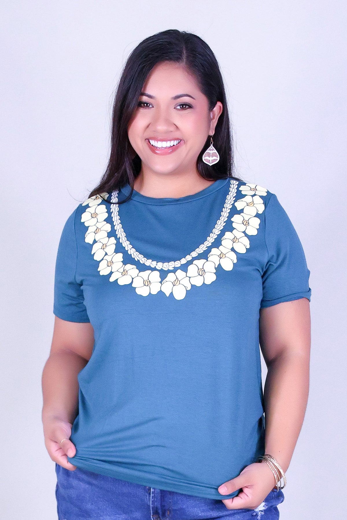 PIKAKE FRONT PUAKENIKENI LEI TEE is available in color JADE and in size 1X, 2X, 3X.