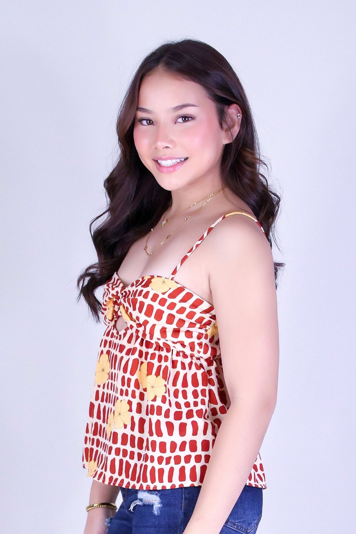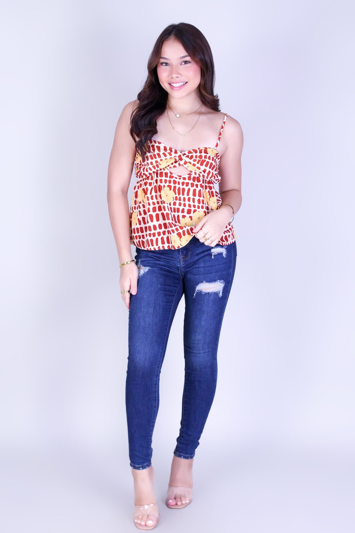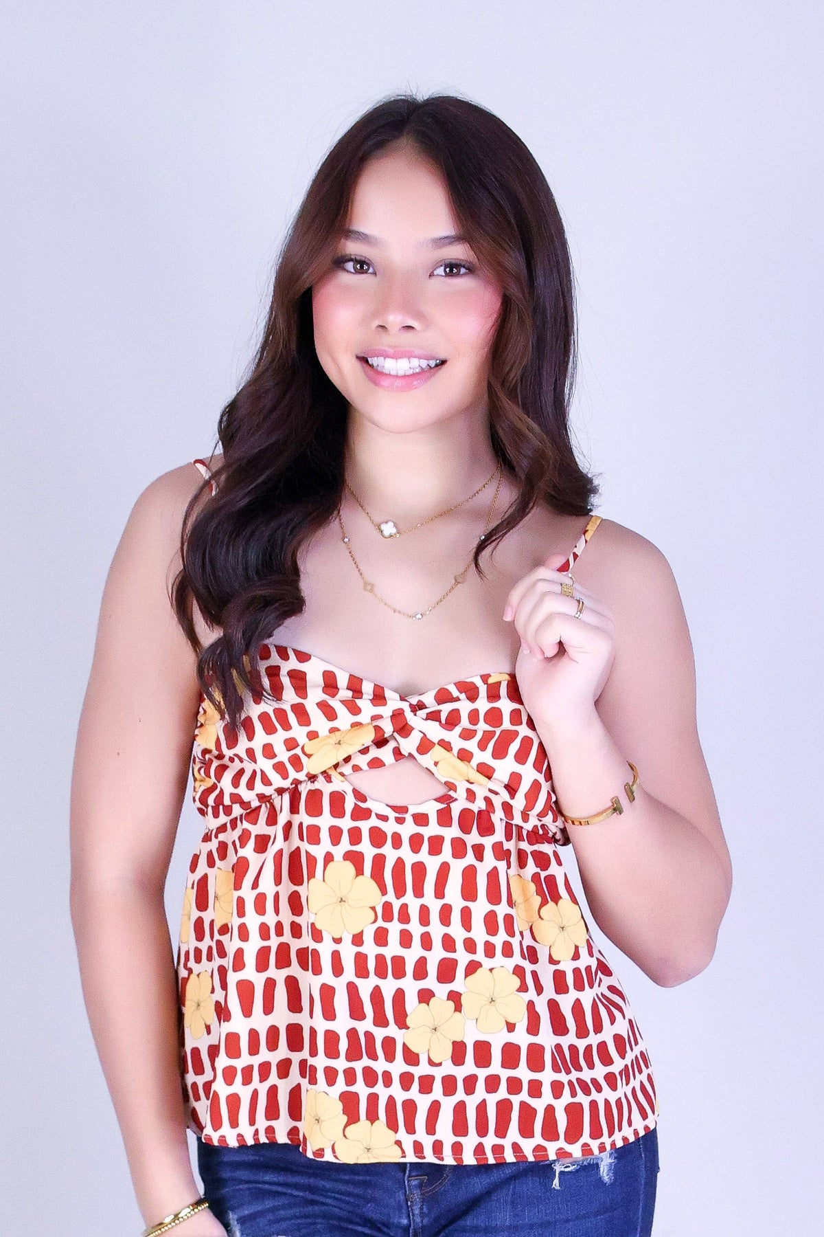 PUAKENIKENI MITER SHELL TWIST CHEST TOP is available in color RUST and in size SMALL, MED, LARGE.