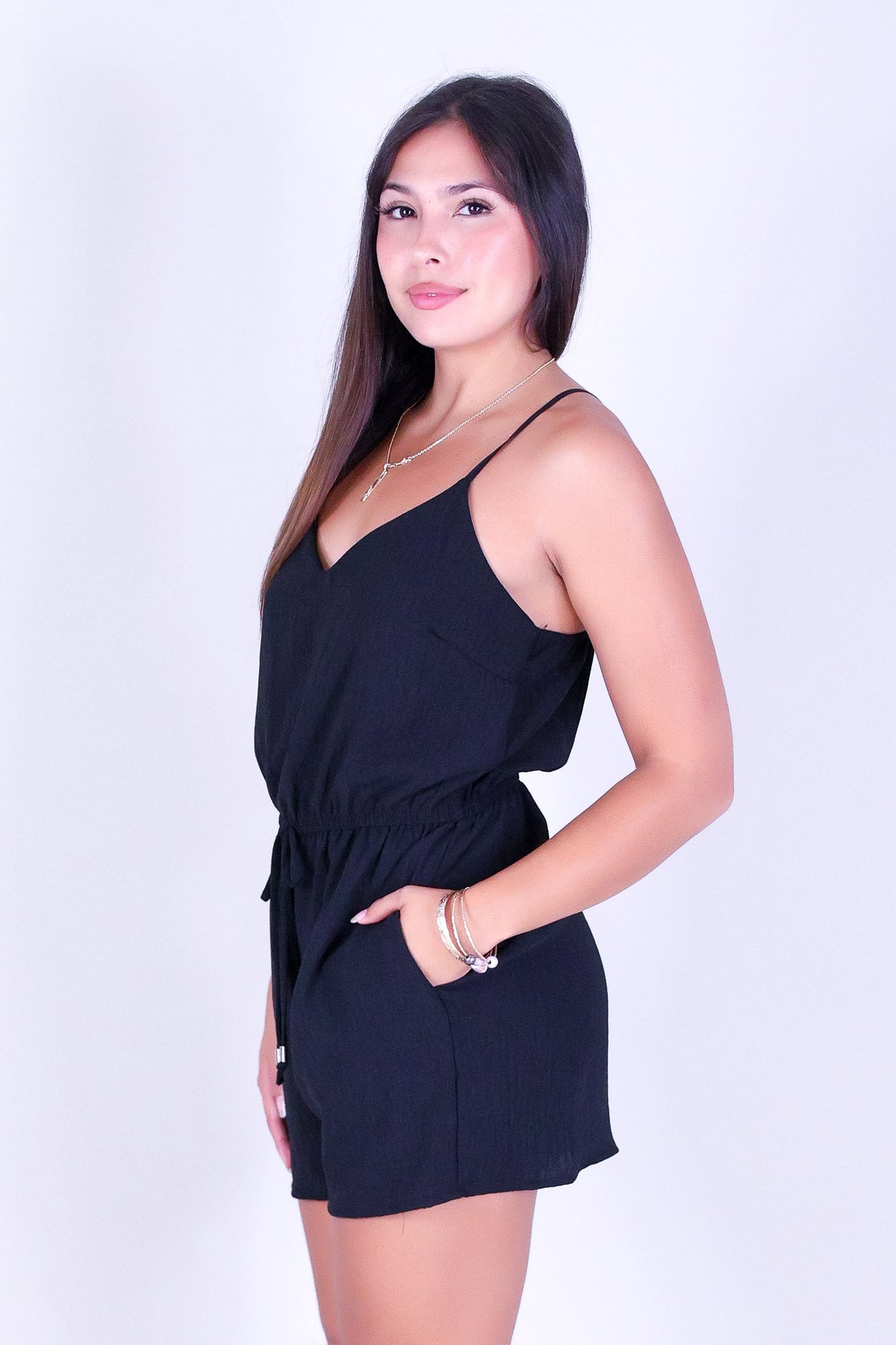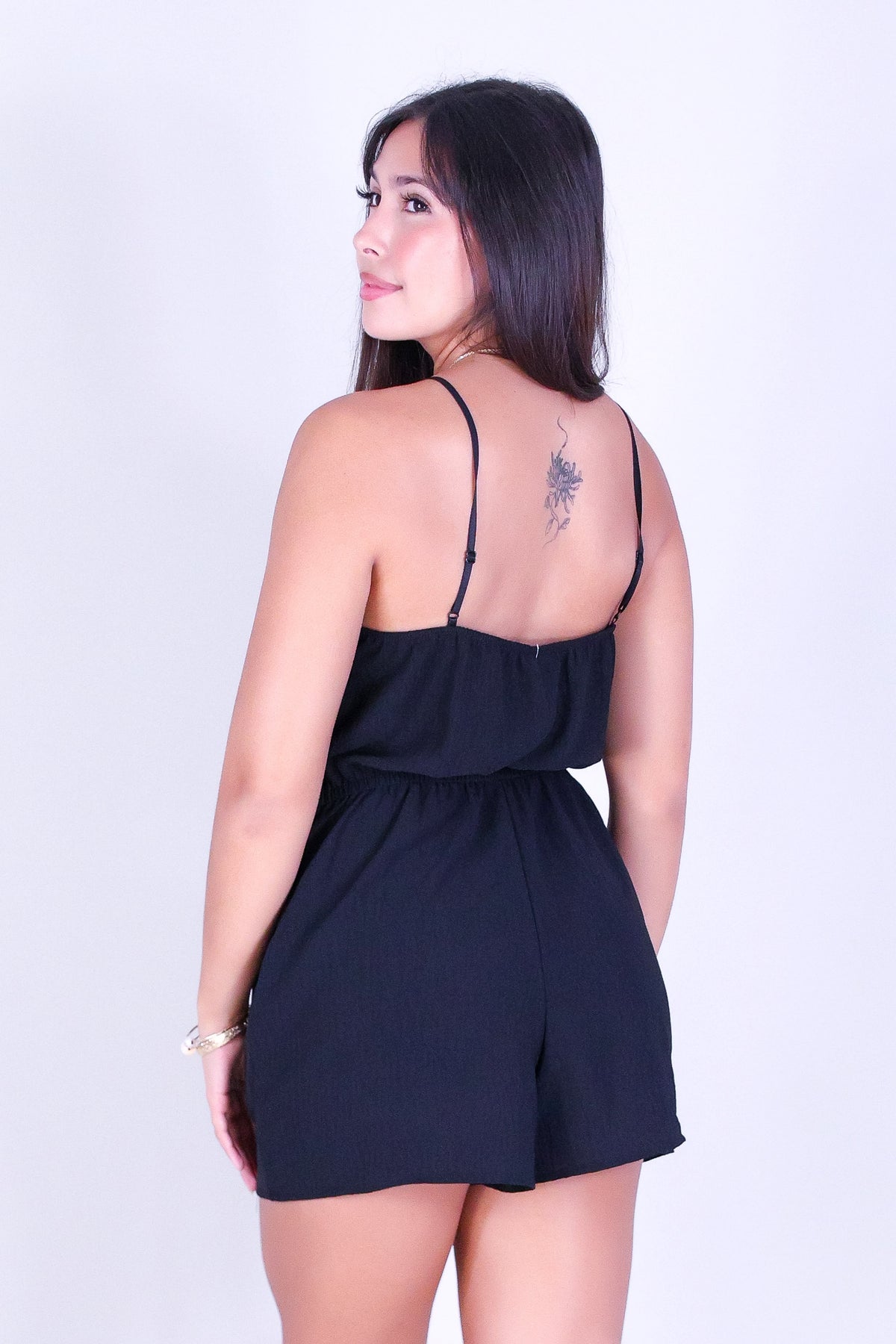 ALL CONFIDENCE ROMPER is available in color BLACK and in size SMALL, MED, LARGE.
