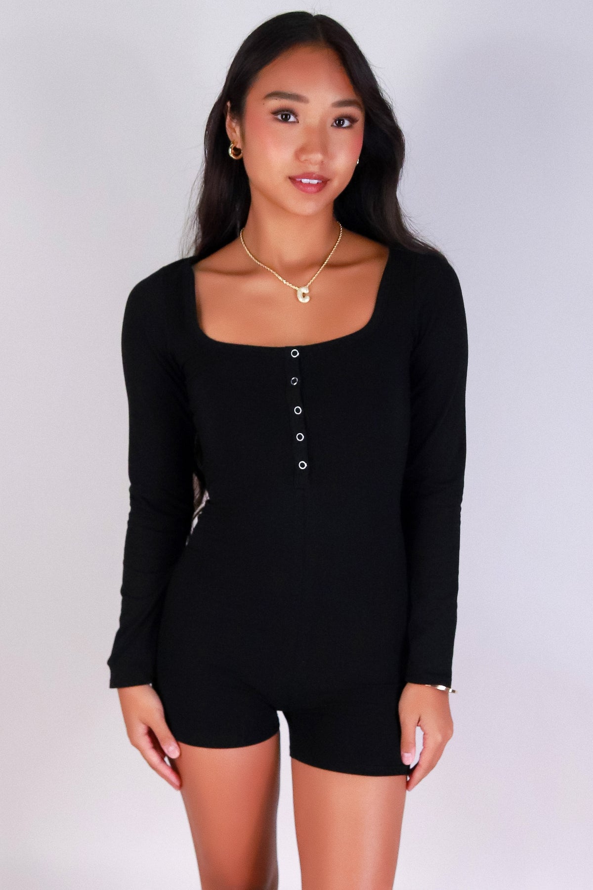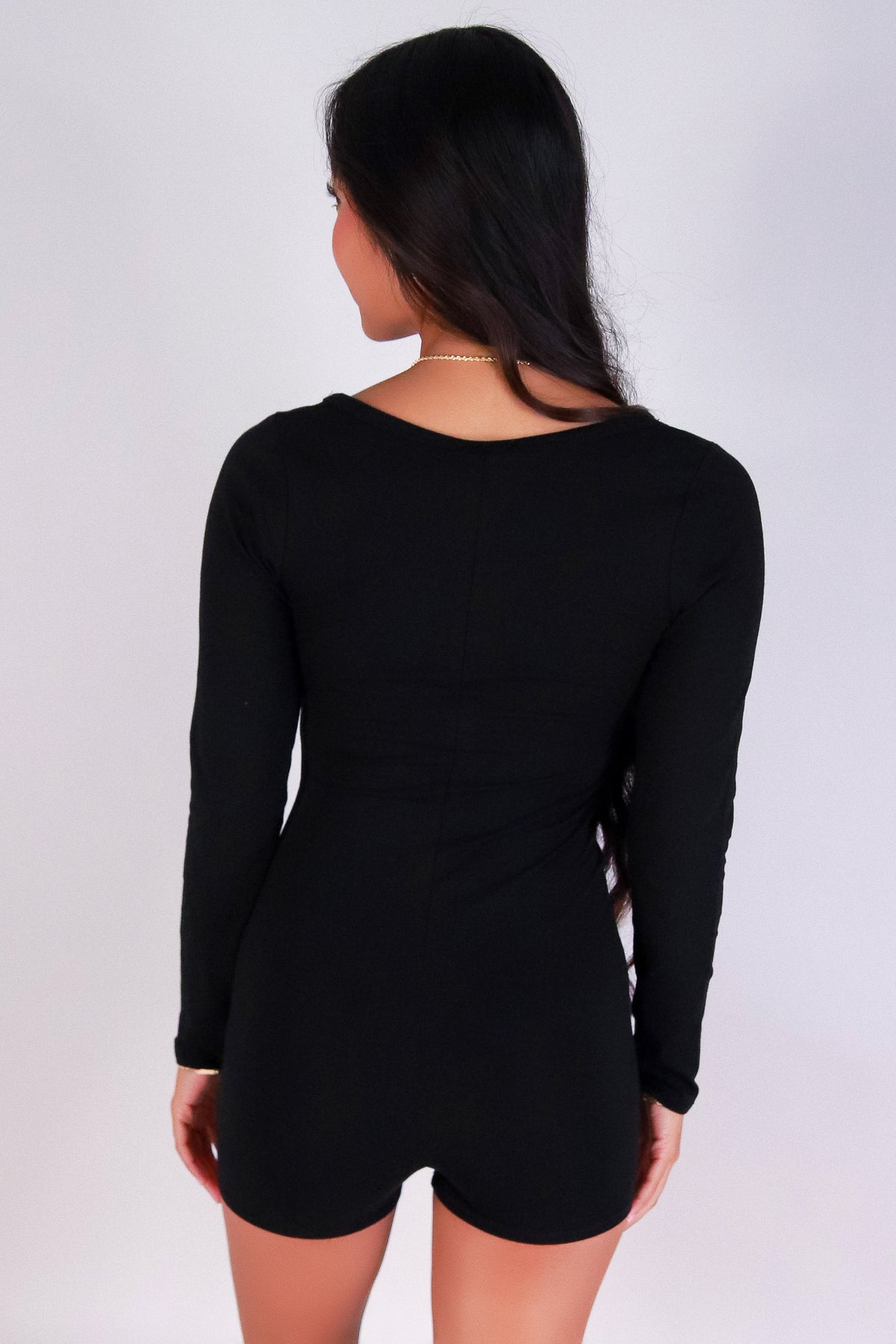 SLEEK CHIC CATSUIT ROMPER is available in color BLACK and in size SMALL, MED, LARGE.