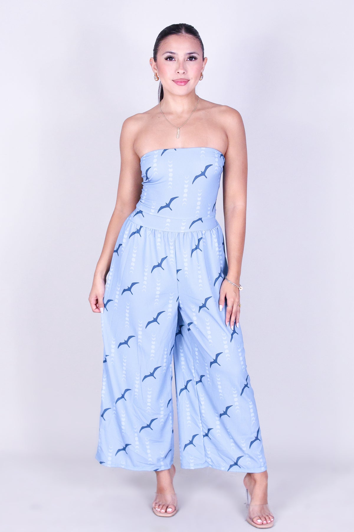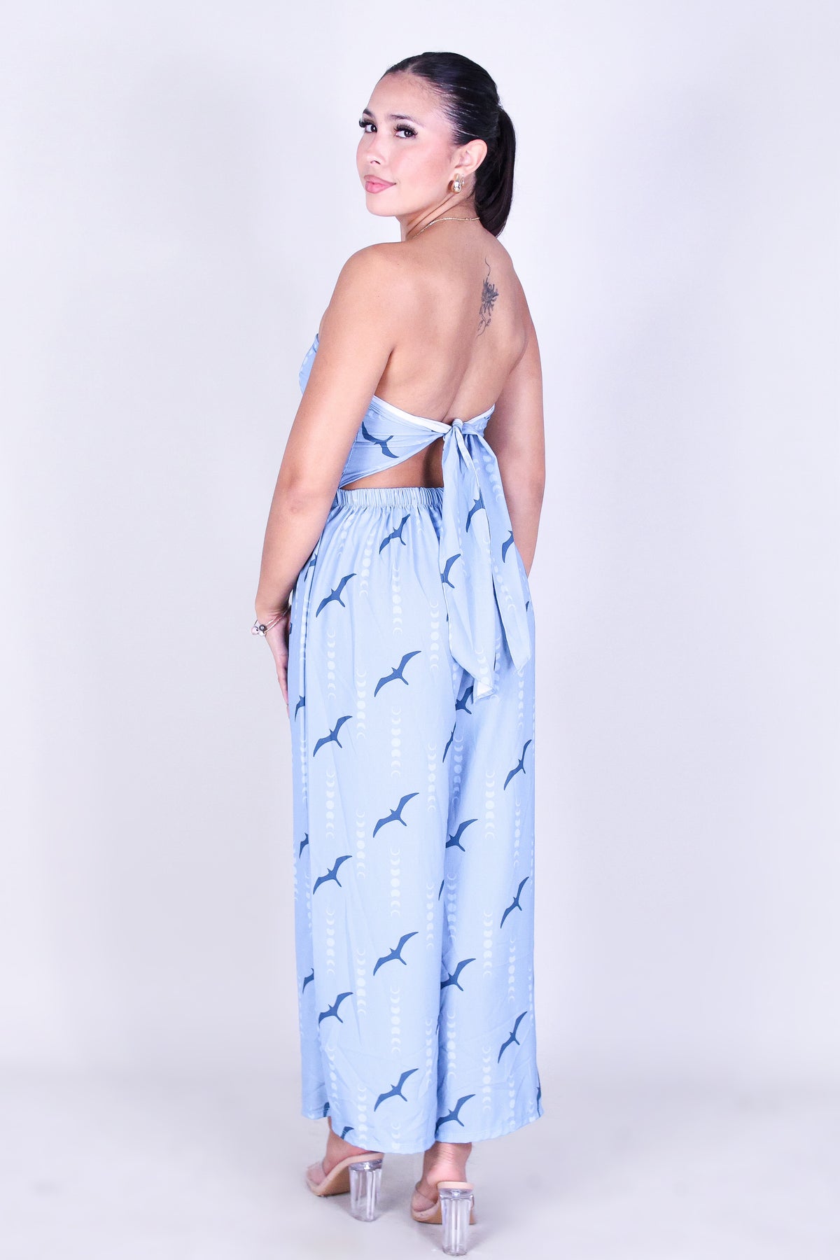 IWA MOON TIE BACK JUMPSUIT is available in color LIGHT BLUE and in size SMALL, MED, LARGE, XL.