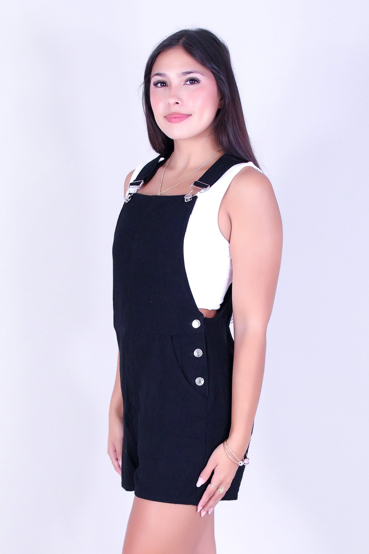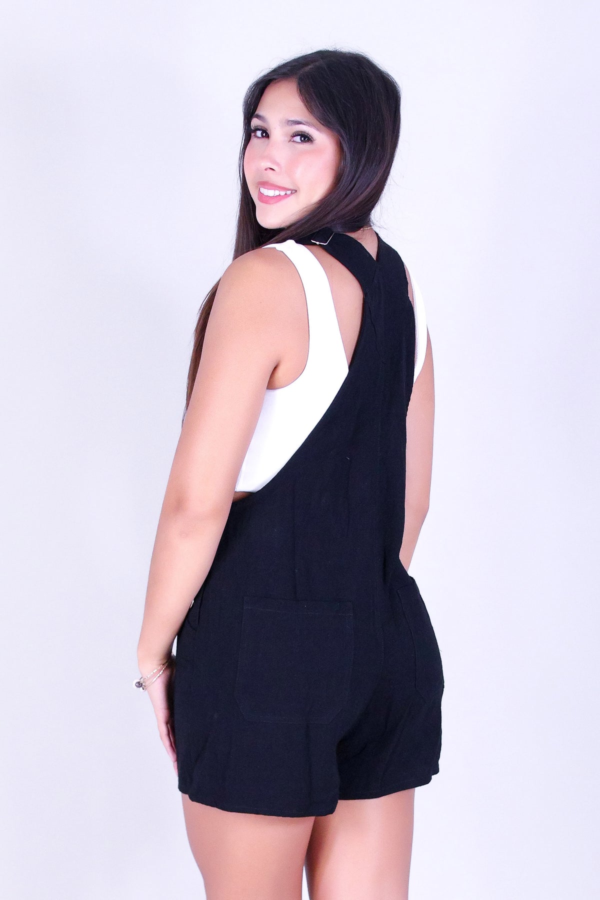 COUNTRY CUTIE OVERALL ROMPER is available in color BLACK and in size SMALL, MED, LARGE.