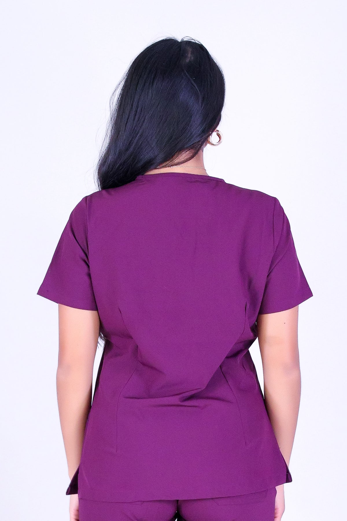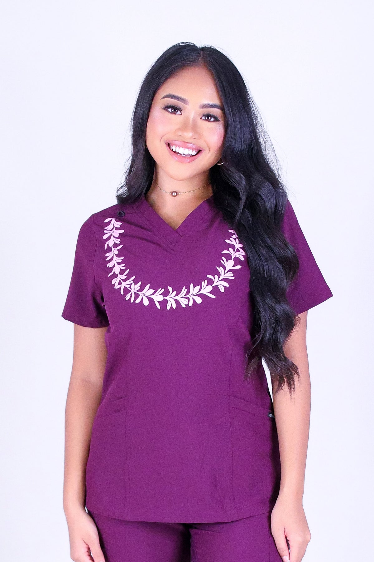 LEI SCRUB TOP is available in color RAISIN and in size XS, SMALL, MED, LARGE.