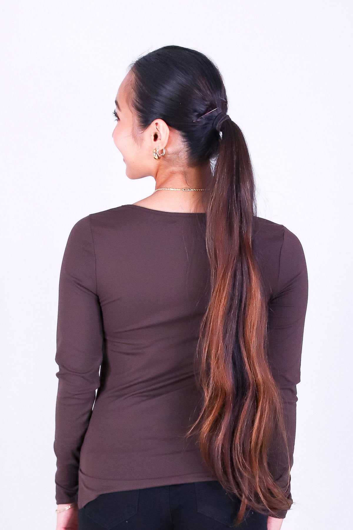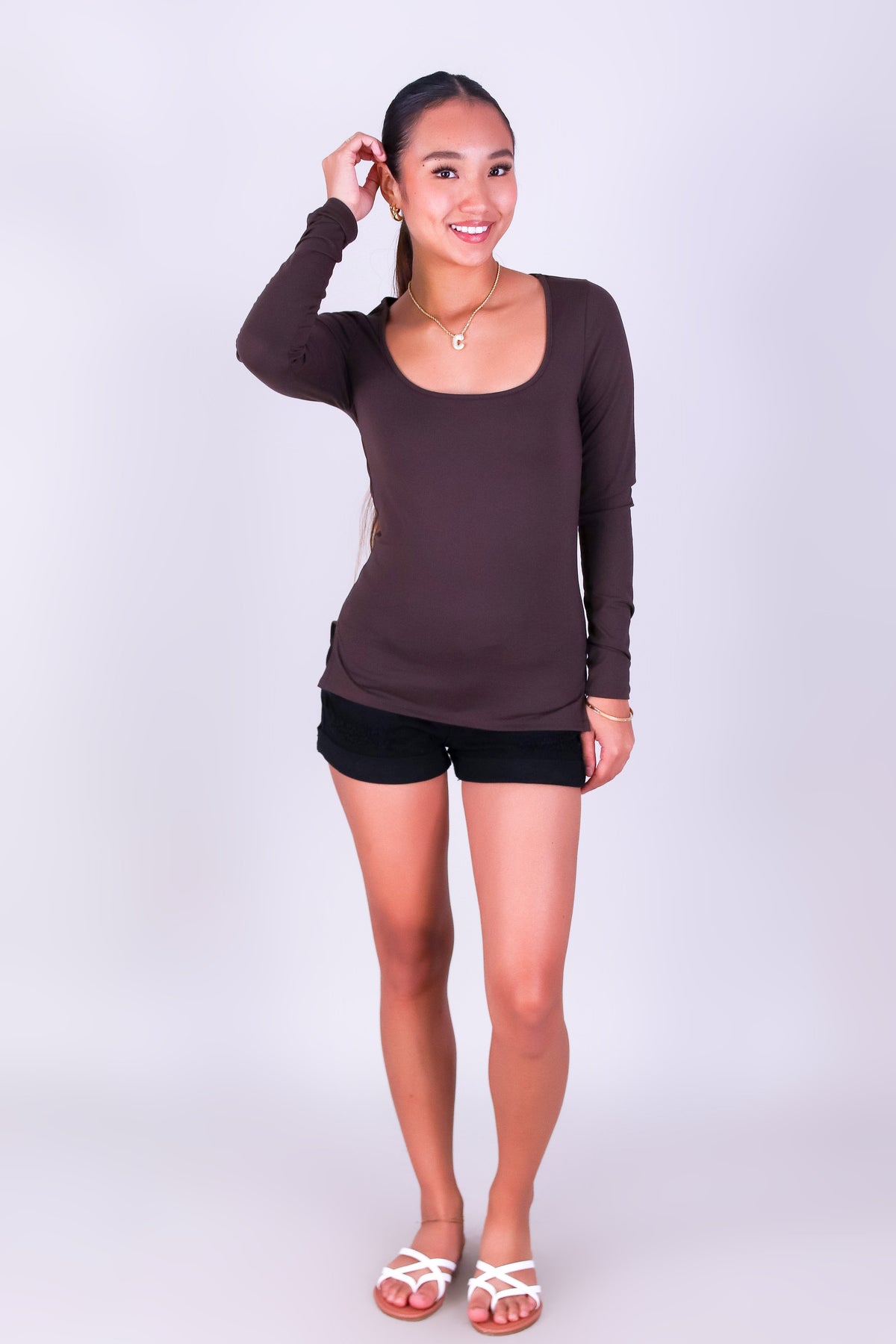 BLUSH SOFT LONG SLEEVE TOP is available in color CHOC and in size SMALL, MED, LARGE.
