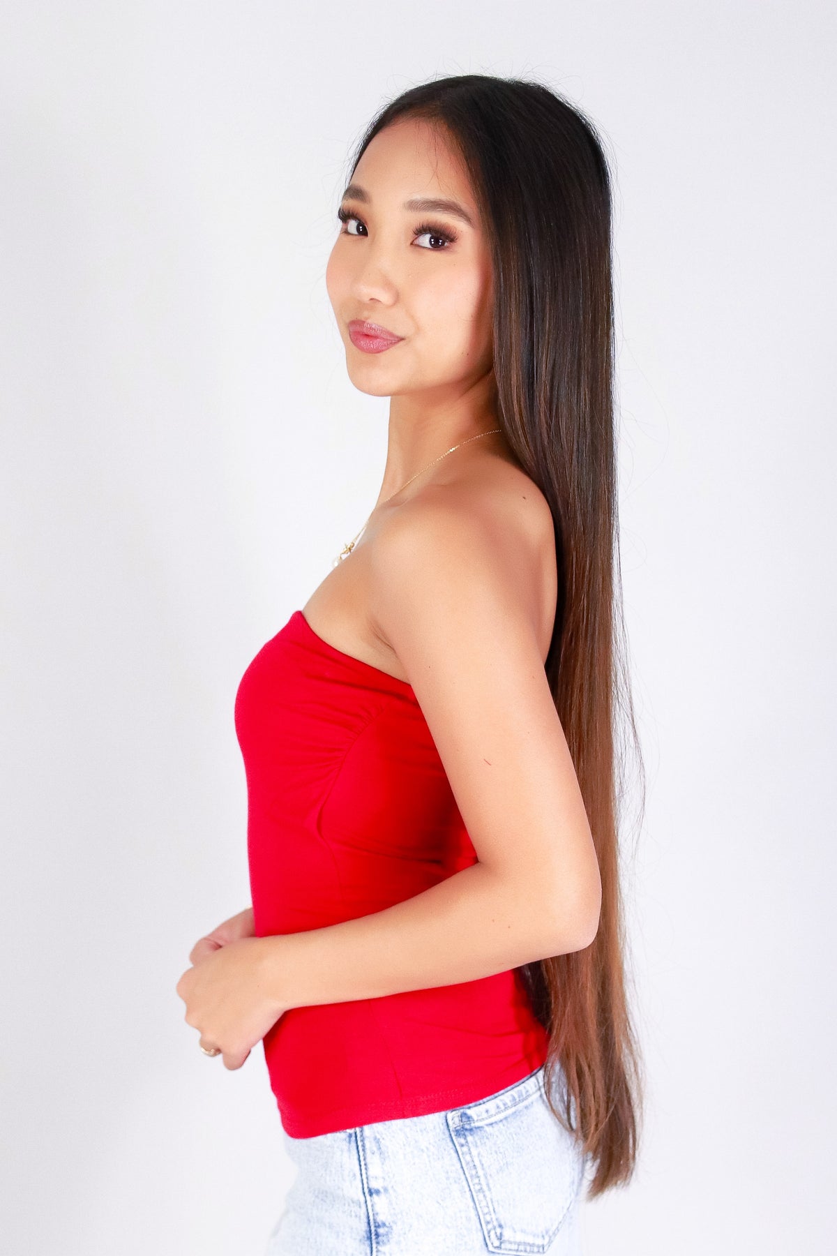 NO TELLING TUBE TOP is available in color RED and in size SMALL, MED, LARGE.