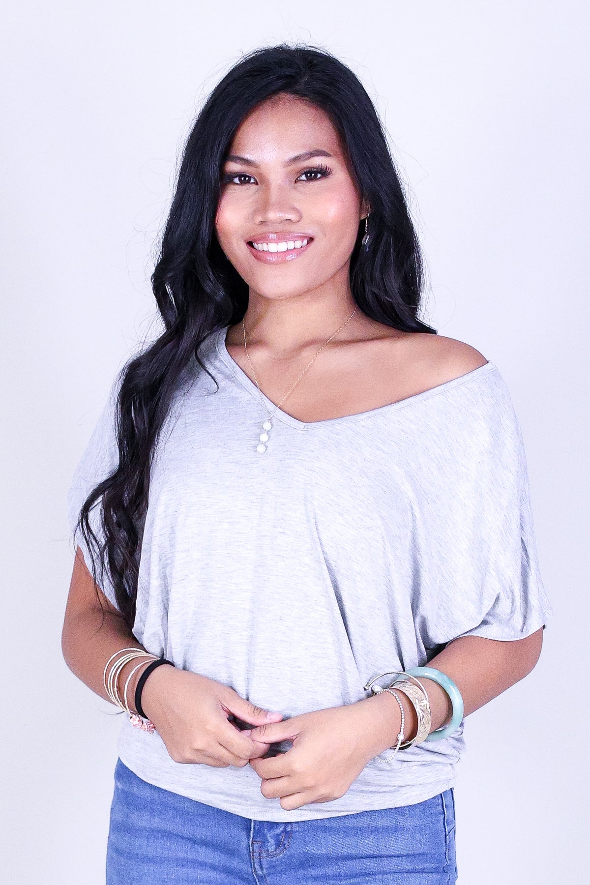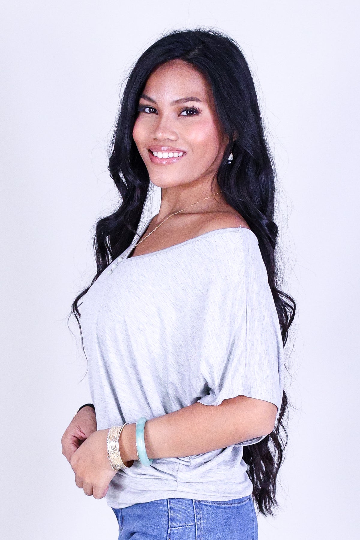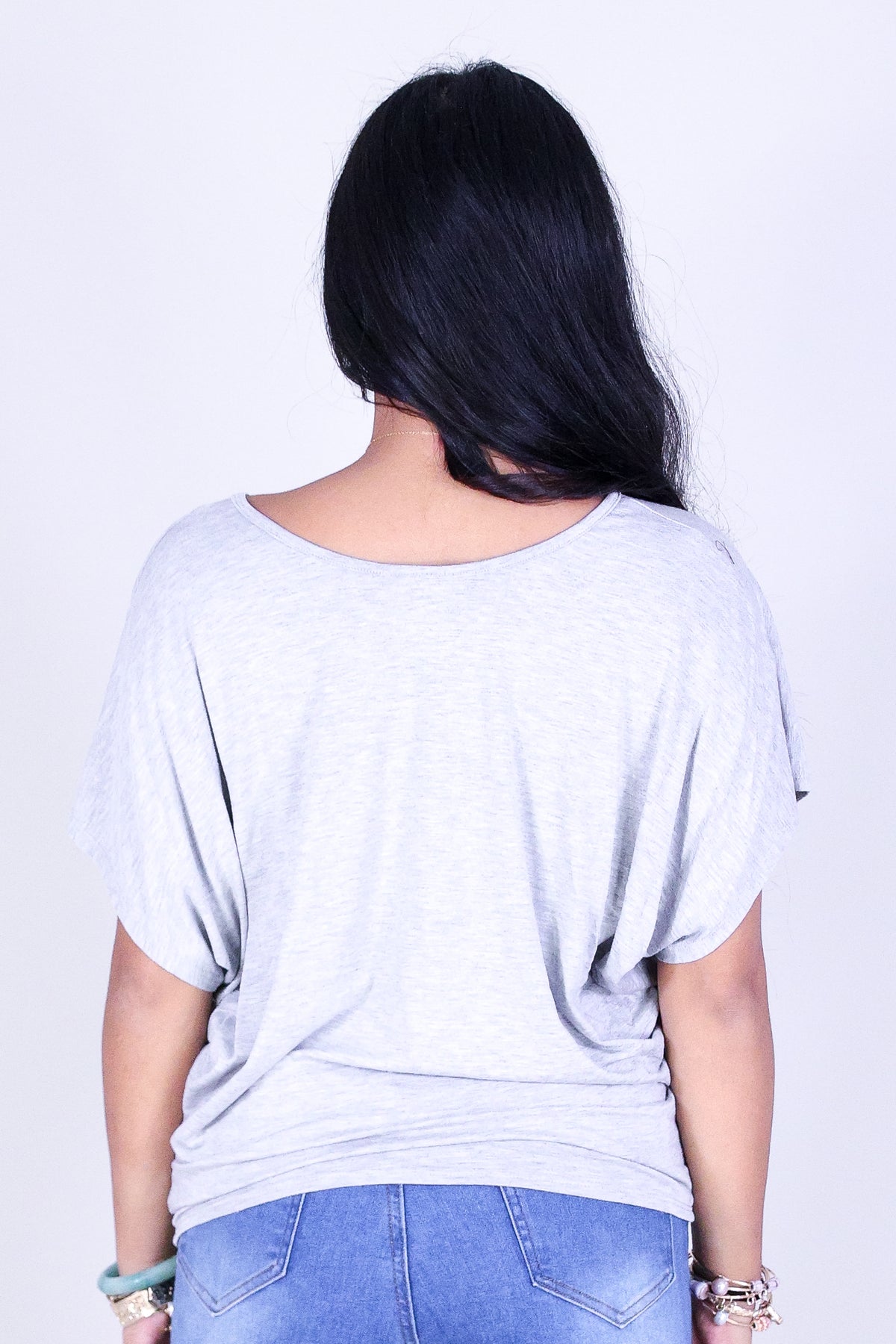 BUYING TIME DOLMAN TOP is available in color H.GREY and in size SMALL, MED, LARGE.
