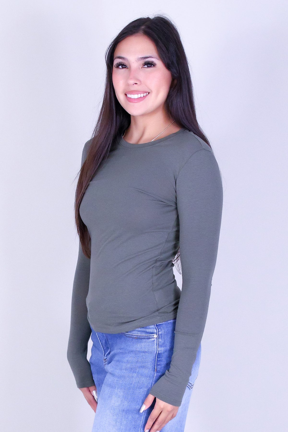 BASIC BABE LONG SLEEVE TOP is available in color OLIVE and in size SMALL, MED, LARGE.