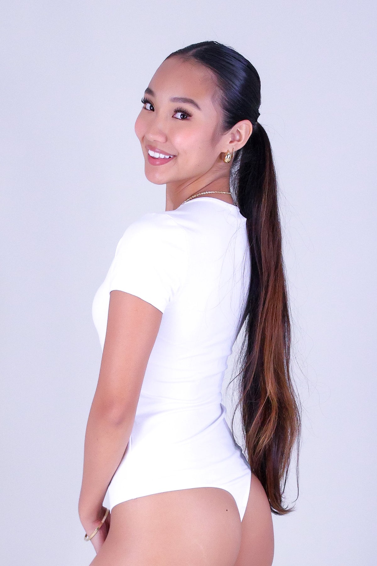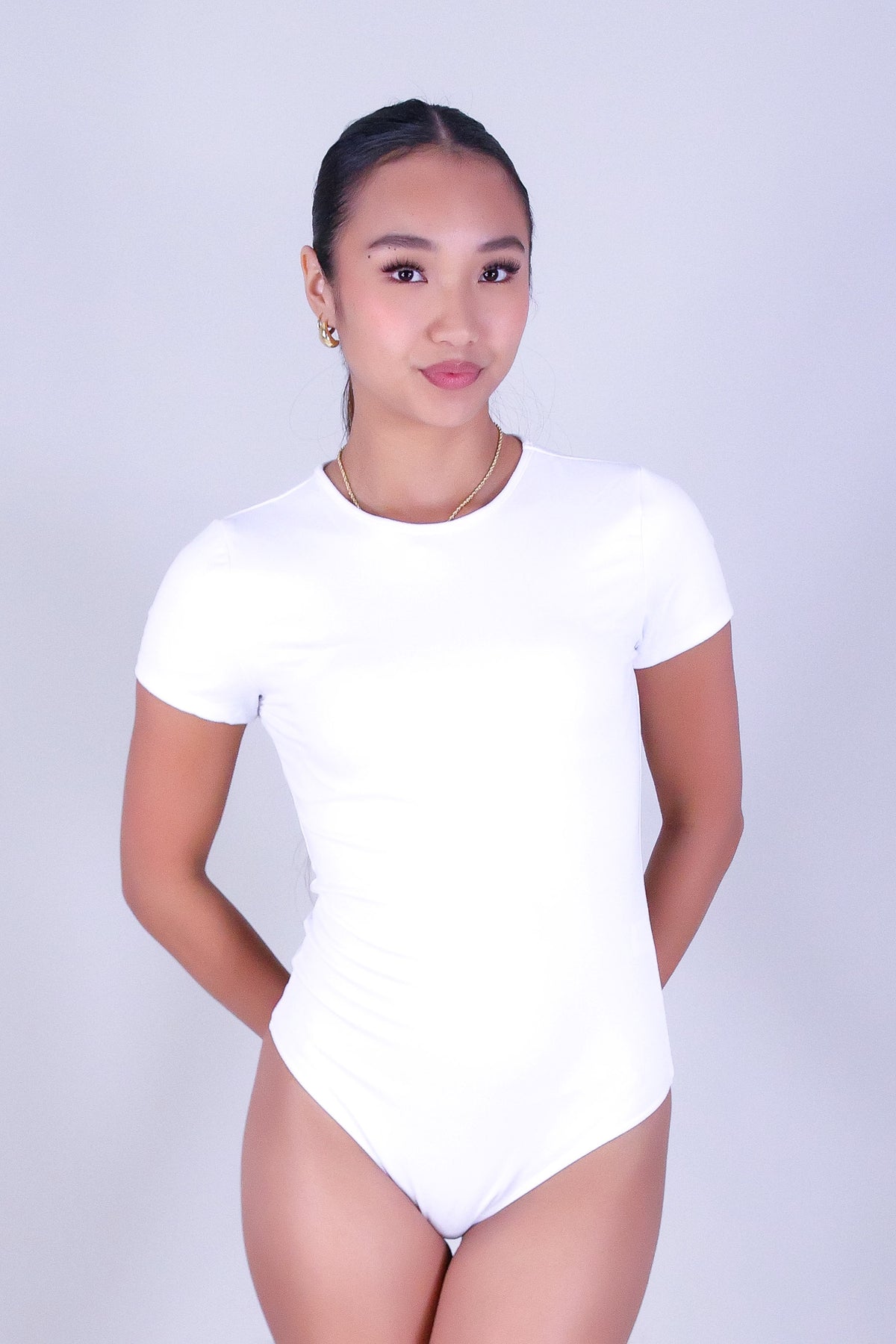 SOFT & SNATCHED BODYSUIT is available in color WHITE and in size SMALL, MED, LARGE.